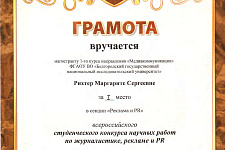 I место в номинации «Магистранты» направления «Реклама и PR» заняла магистрантка первого года обучения по направлению подготовки «Медакоммуникации» Маргарита Рихтер, представив под руководством старшего преподавателя кафедры коммуникативистики, рекламы и связей с общественностью Анны Белоедовой научно-исследовательскую работу «Женщина глазами мужчины: анализ функционирования женского образа в рекламе мужских глянцевых журналов».