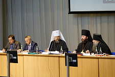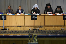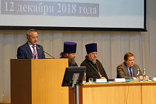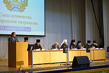 Председатель Белгородской областной Думы Василий Потрясаев приветствовал участников съезда от имени губернатора региона Евгения Савченко. Василий Николаевич рассказал о достижениях Белгородской области в экономике, образовании и культуре, а также о взаимодействии исполнительной и законодательной власти с церковью.