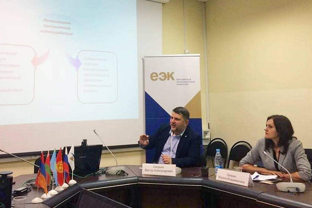 В рамках программы научно-исследовательского обмена Евразийского экономического союза, проводимого Центром комплексных европейских и международных исследований (ЦКЕМИ) НИУ ВШЭ для Евразийской экономической комиссии заведующий кафедрой социальных технологий НИУ «БелГУ» Виктор Сапрыка выступил с лекцией «Приграничное сотрудничество в ЕАЭС».