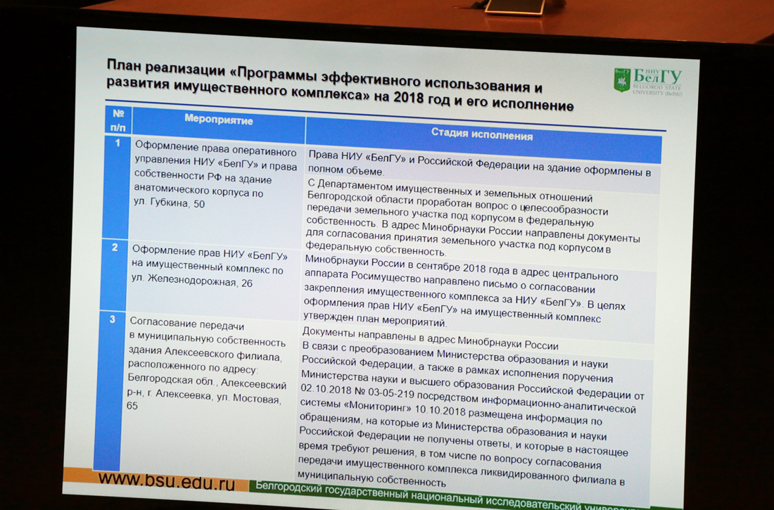 О результатах выполнения программы эффективного использования и развития имущественного комплекса НИУ «БелГУ» в 2018 году и задачах на 2019 год сообщили проректор по комплексной безопасности и развитию имущественного комплекса Николай Голубоцких и проректор по строительству и хозяйственной работе Валентин Затенацкий. Николай Павлович отметил, что в университете используется принцип программного подхода к управлению имуществом. Главная цель состоит в модернизации, оптимизации и развитии материально-технической базы для эффективного обеспечения ведения уставной деятельности учреждения. Николай Голубоцких представил план реализации «Программы эффективного использования и развития имущественного комплекса» на 2019 год.
