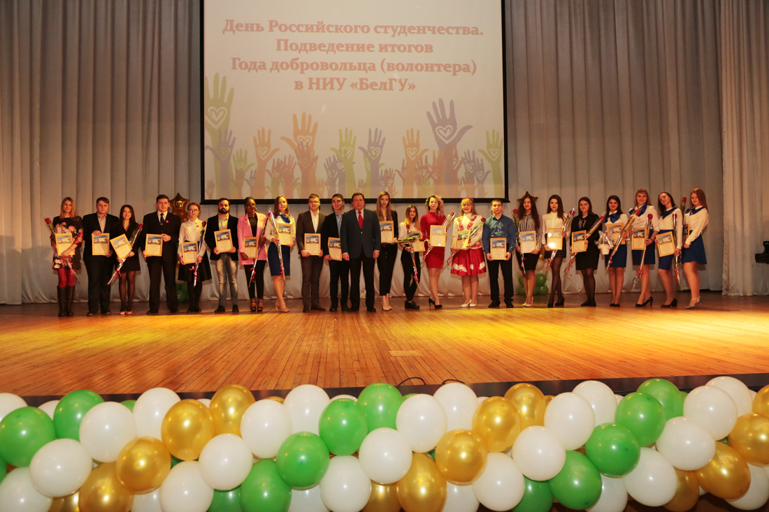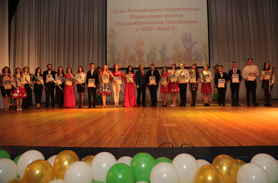 Продолжился праздник торжественным концертом в честь Дня российского студенчества и подведения итогов Года добровольца (волонтера) в России. Почётными гостями вечера стали ректор НИУ «БелГУ» Олег Полухин, заместитель председателя Совета Белгородской областной общественной организации ветеранов войны, труда, вооружённых сил и правоохранительных органов Анатолий Бурик; специалист по работе с молодёжью ЦМИ Сергей Гриценко, начальник управления воспроизводства окружающей среды департамента агропромышленного комплекса и воспроизводства окружающей среды Белгородской области Андрей Головков, специалист проекта «Красный крест и молодёжь» БРО «Российский Красный Крест» Ирина Тупицына, начальник управления молодёжной политики администрации Белгорода Алина Денищик.