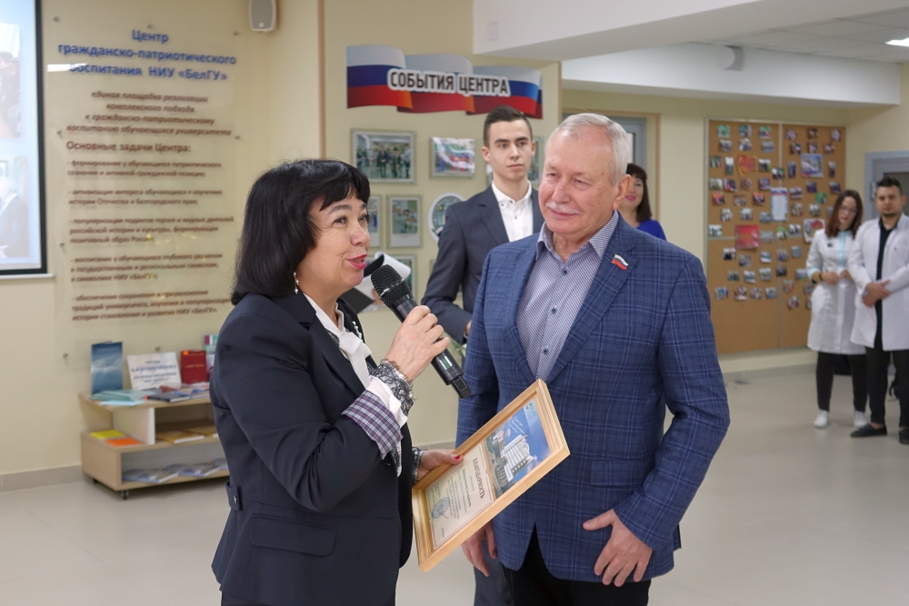 Проректор по воспитательной работе и молодёжной политике НИУ «БелГУ» Светлана Острикова вручила Владимиру Фёдоровичу Благодарность за активное участие в эстафете добрых дел, посвящённой юбилею области. В завершение мероприятия студентам медицинского института были вручены авторские книги Владимира Куликовского.