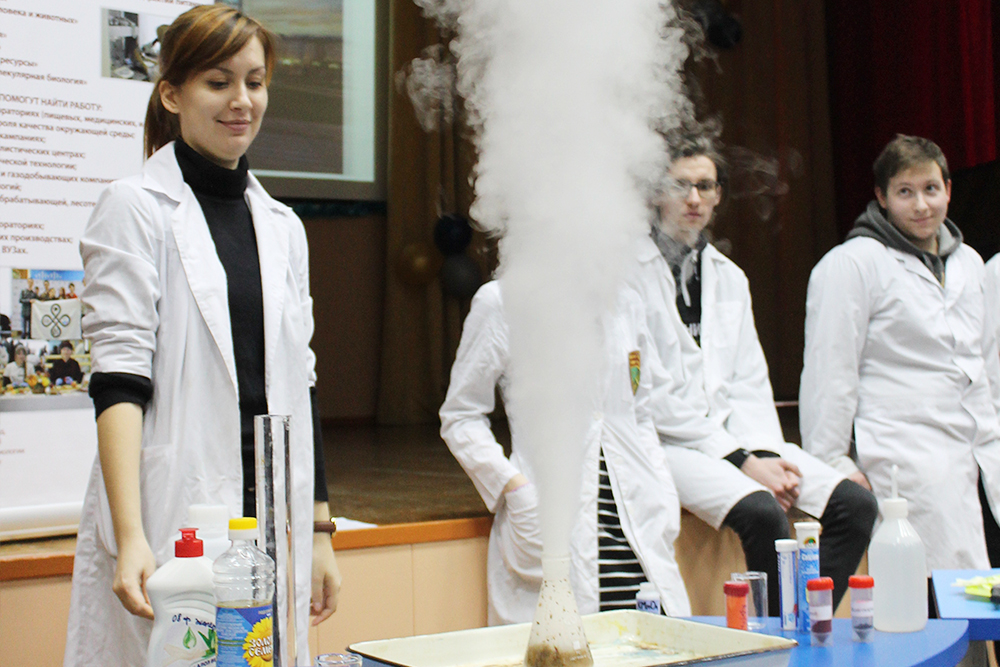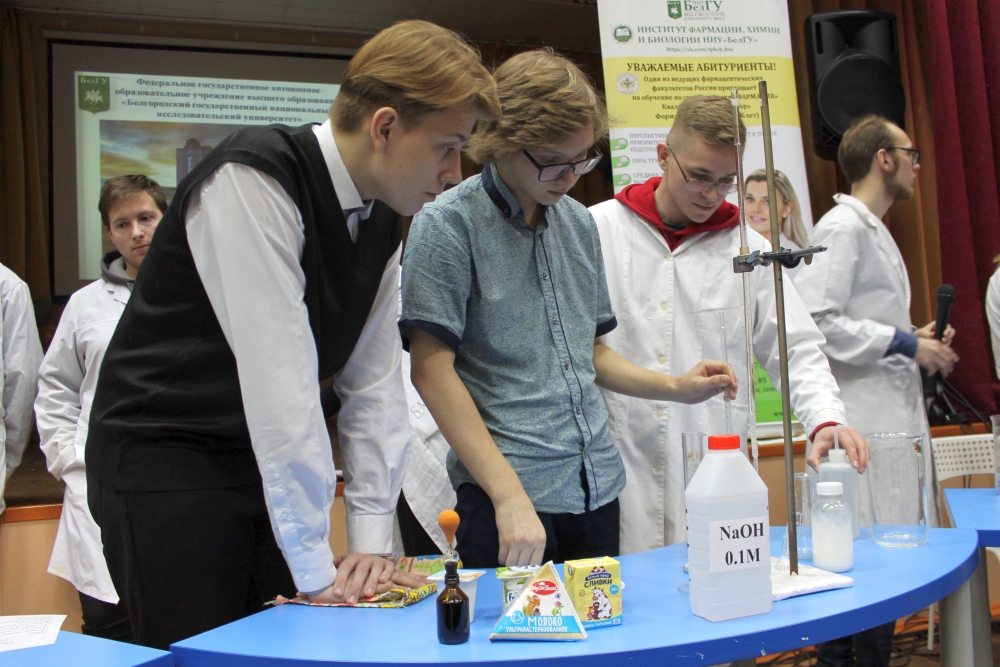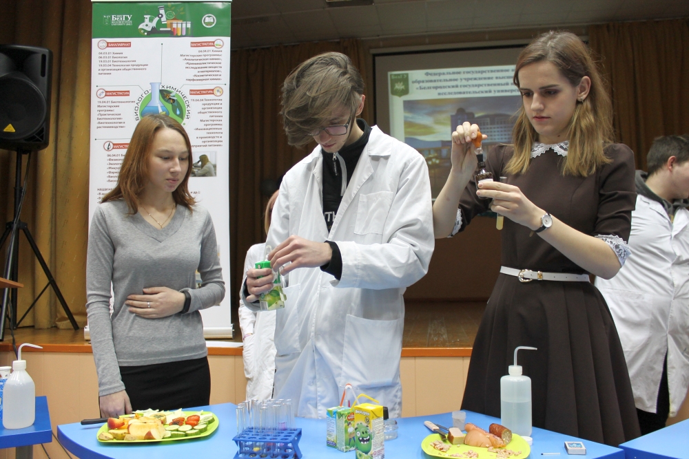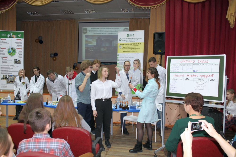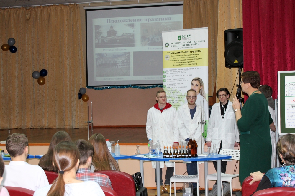 Доцент кафедры общей химии Людмила Колчанова представила направление подготовки «Химия». Преподаватель НИУ «БелГУ» ознакомила учащихся с магистерскими программами этого направления, сообщила о предоставляемых вузом возможностях академической мобильности: студенты выезжают на семестр для обучения в Казахский Национальный университет им. аль-Фараби, Университет прикладных наук Ханзе, Нидерланды. Людмила Васильевна напомнила школьникам о знаменательном событии года для всех химиков – 150-летии со времени открытия Периодического закона и Периодической системы Дмитрием Менделеевым