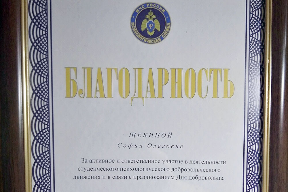 За активное участие в деятельности студенческого психологического добровольческого движения и в связи с празднованием Дня добровольца София Щекина и Анастасия Выскребенцева получили Благодарности от директора Центра экстренной психологической помощи МЧС России Юлии Шойгу, а Тимур Швалюк - от начальника Главного управления МЧС России по Белгородской области генерал-майора внутренней службы Сергея Потапова.
