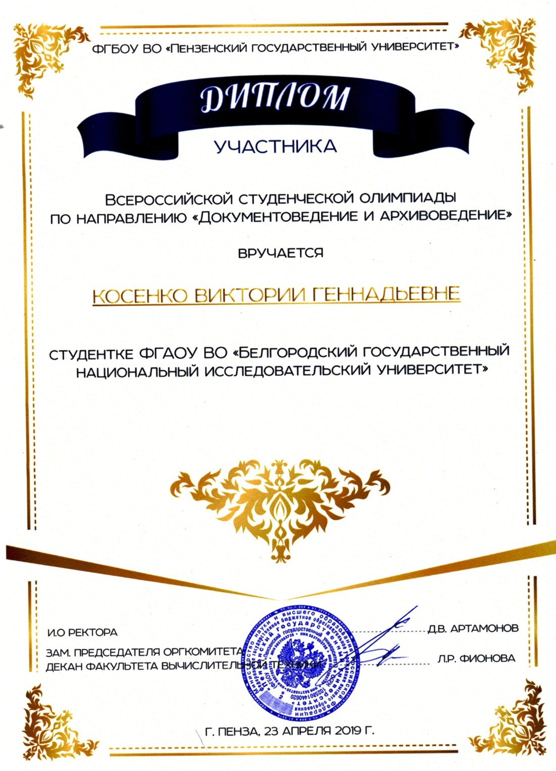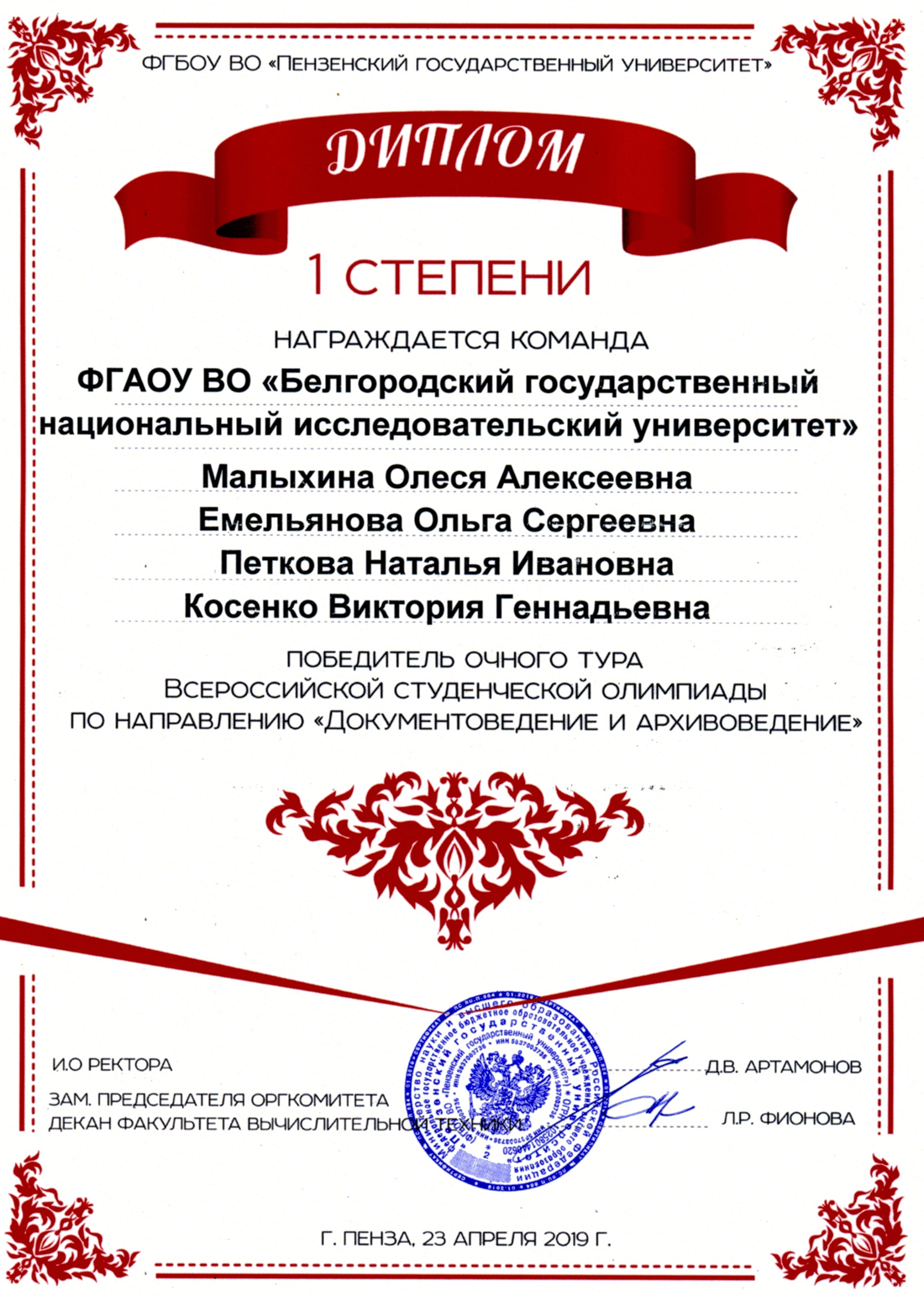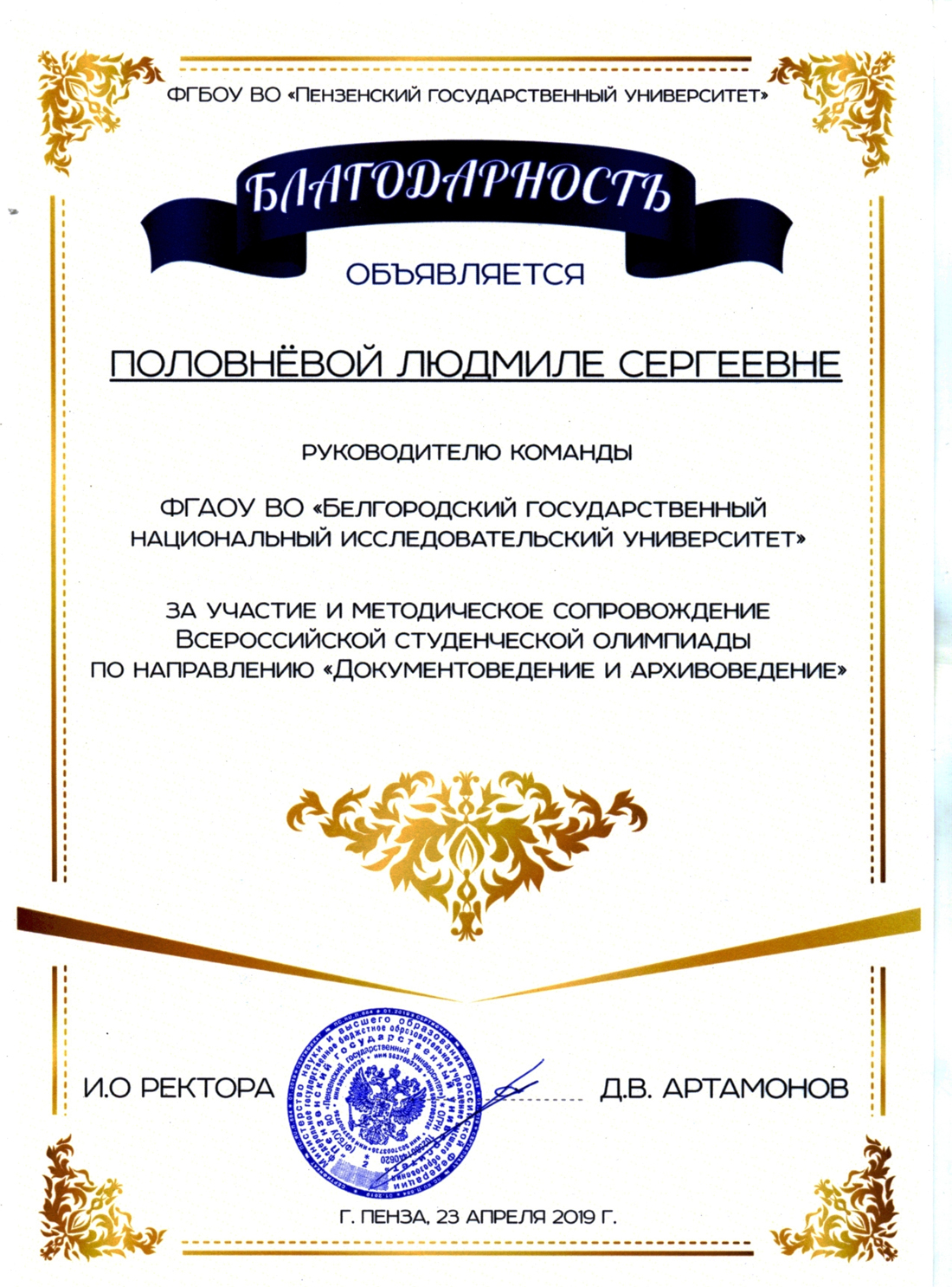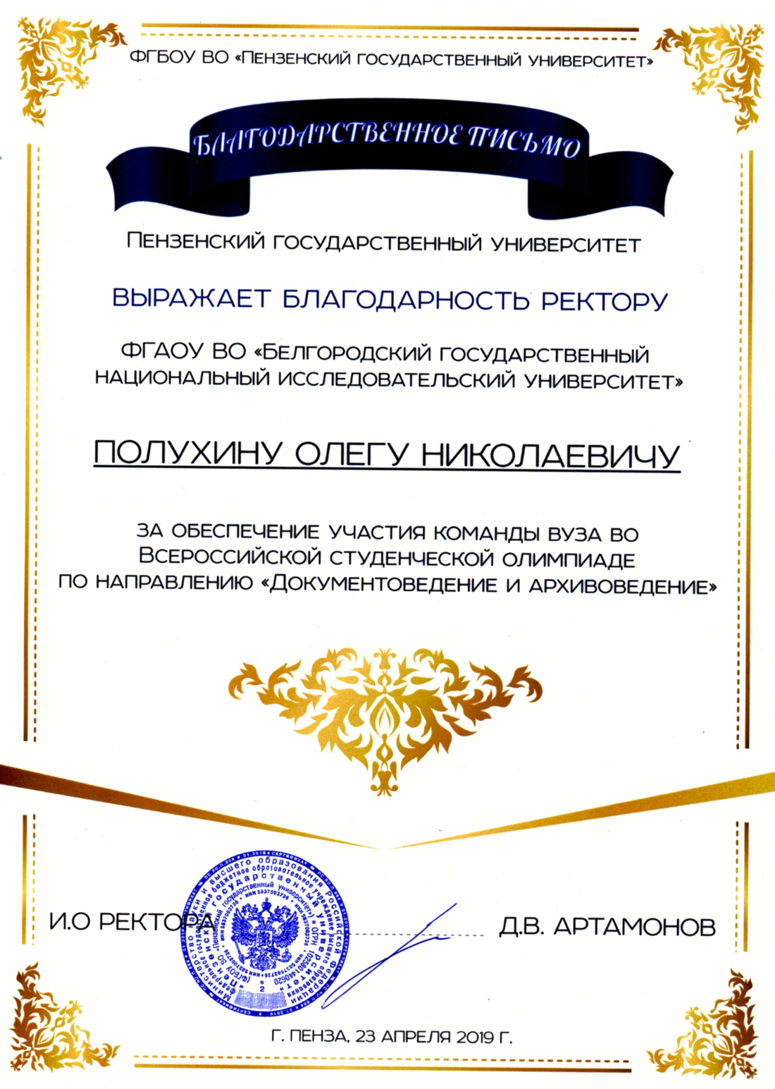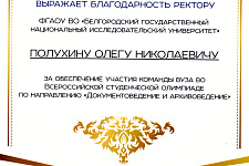 Исполняющий обязанности ректора Пензенского государственного университета Дмитрий Артамонов выразил благодарность ректору НИУ «БелГУ» Олегу Полухину и руководителю команды университета Людмиле Половневой за обеспечение участия команды вуза во всероссийской студенческой олимпиаде по направлению «Документоведение и архивоведение» и её методическое сопровождение.