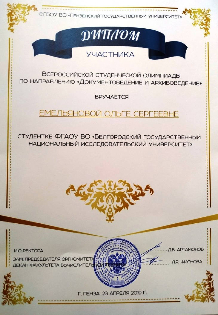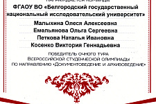 Студенты историко-филологического факультета педагогического института НИУ «БелГУ» победили во всероссийской студенческой олимпиаде по направлению «Документоведение и архивоведение»