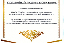 Студенты историко-филологического факультета педагогического института НИУ «БелГУ» – Виктория Косенко, Наталья Петкова, Ольга Емельянова и Олеся Малыхина – под руководством доцента кафедры российской истории и документоведения Людмилы Половнёвой приняли участие во Всероссийской студенческой олимпиаде по направлению «Документоведение и архивоведение».