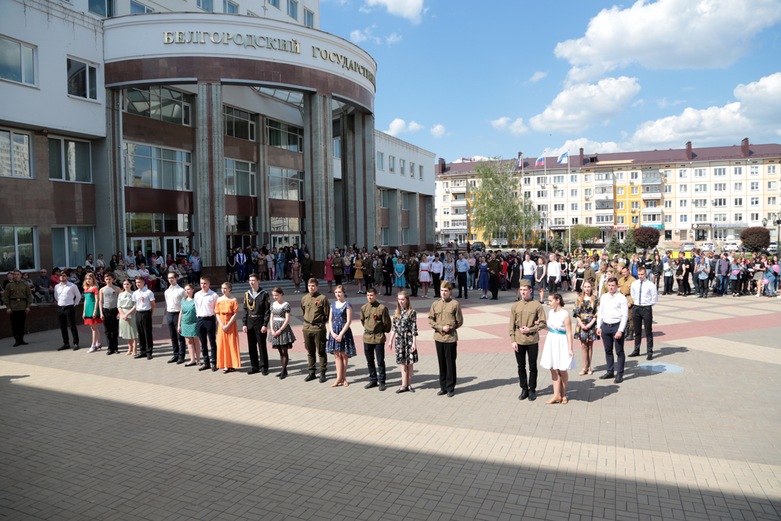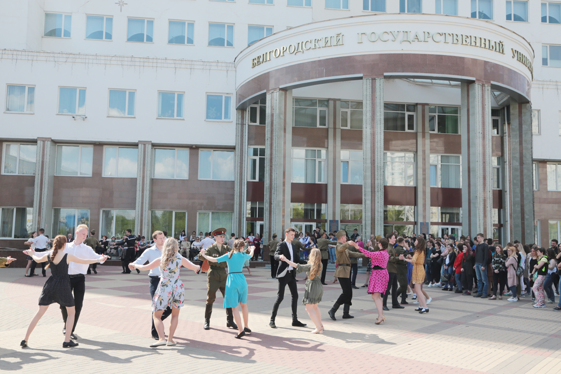 Молодёжная патриотическая акция «Вальс Победы» прошла на университетской площади. Организаторами мероприятия выступили молодежный культурный центр, Союз студентов и Совет ветеранов НИУ «БелГУ». В акции приняли участие ветераны труда НИУ «БелГУ», студенты, преподаватели и сотрудники университета. Открыли акцию музыканты ректорского оркестра НИУ «БелГУ», исполнив фанфары «День Победы».