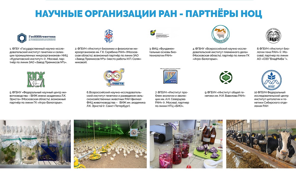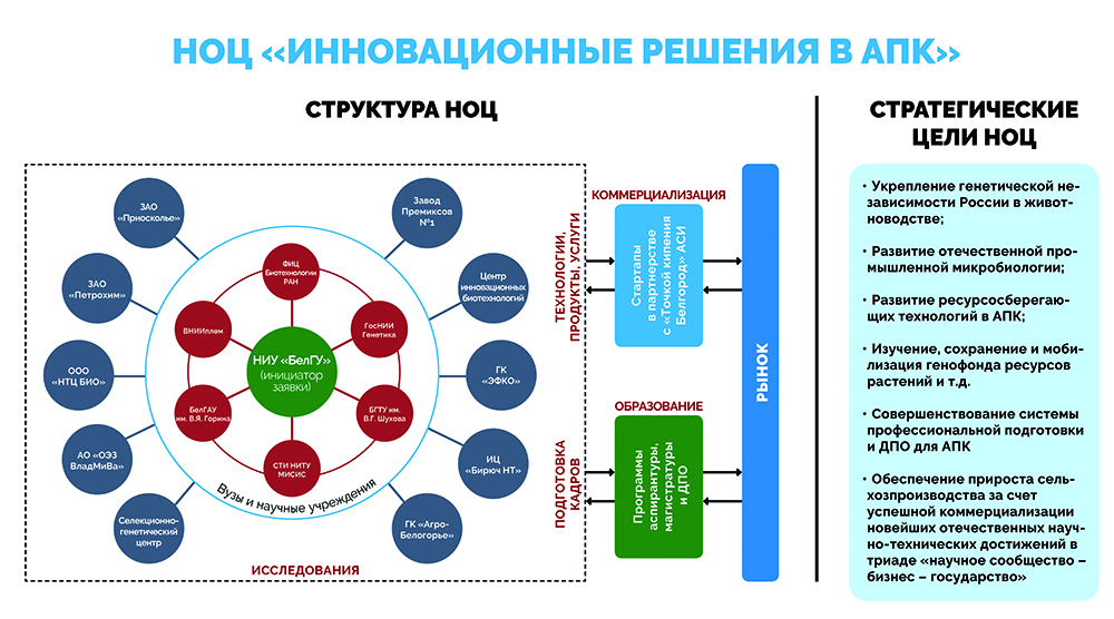 В трех регионах, в том числе в Белгородской области, уже определены партнеры из числа вузов и предприятий. Белгородский НОЦ «Инновационные решения в АПК», деятельность которого координирует губернатор области Евгений Савченко, объединяет НИУ «БелГУ», который выступит интегратором участников научно-образовательного центра, БГТУ им. В.Г.Шухова, БГАУ им. В.Я. Горина и структуры РАН. Партнёрами НОЦ являются АО ЭФКО, ЗАО "ГК «Агро-Белогорье»", ЗАО «Приосколье», ЗАО «Завод премиксов №1» и другие. Программа развития НОЦ предполагает реализацию разработанных совместно с индустриальными партнёрами проектов, обеспечивающих получение и последующую коммерциализацию востребованных для страны и региона новых конкурентоспособных на мировом рынке продуктов и технологий. Обозначены следующие основные направления деятельности НОЦ:
