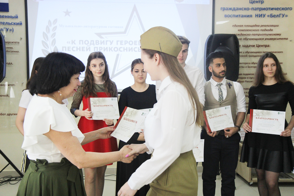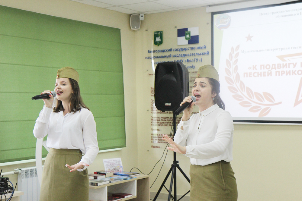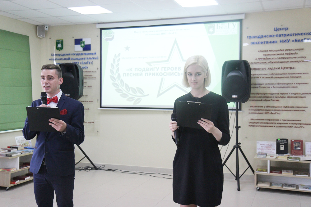 Музыкально-литературную гостиную открыло выступление вокальной группы «Университет» с песней «Военное танго». Проректор по воспитательной работе и молодёжной политике НИУ «БелГУ» Светлана Острикова, приветствуя исполнителей и слушателей, отметила, что война затронула почти каждую семью, очень многие солдаты уходили на фронт и не возвращались. Светлана Александровна призвала помнить о погибших и ныне живущих героях Великой Отечественной войны.