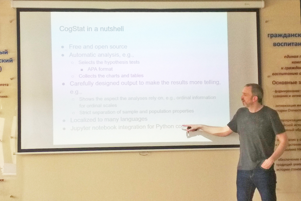 Руководитель лаборатории прикладных кибернетических систем МФТИ Тимур Бергалиев сообщил о современном состоянии дел в интеллектуальной робототехнике, рассказал о биосенсорике и возможности изучения и обработки биосигналов. Эксперт из Белгорода Ульяна Москвитина обозначила новый тренд в нейронауках – изучение того, как наш мозг воспринимает пространство. Атилла Крайчи (Будапешт, Венгрия) презентовал свою программу CogStat, которая позволит без особых усилий выполнить статистический анализ данных. Данная программа уже доступна на многих языках, но русской версии пока нет. Участники школы обсудили вопрос создания русскоязычной версии программы, чтобы учёные и студенты в НИУ «БелГУ» могли использовать её в своей работе.