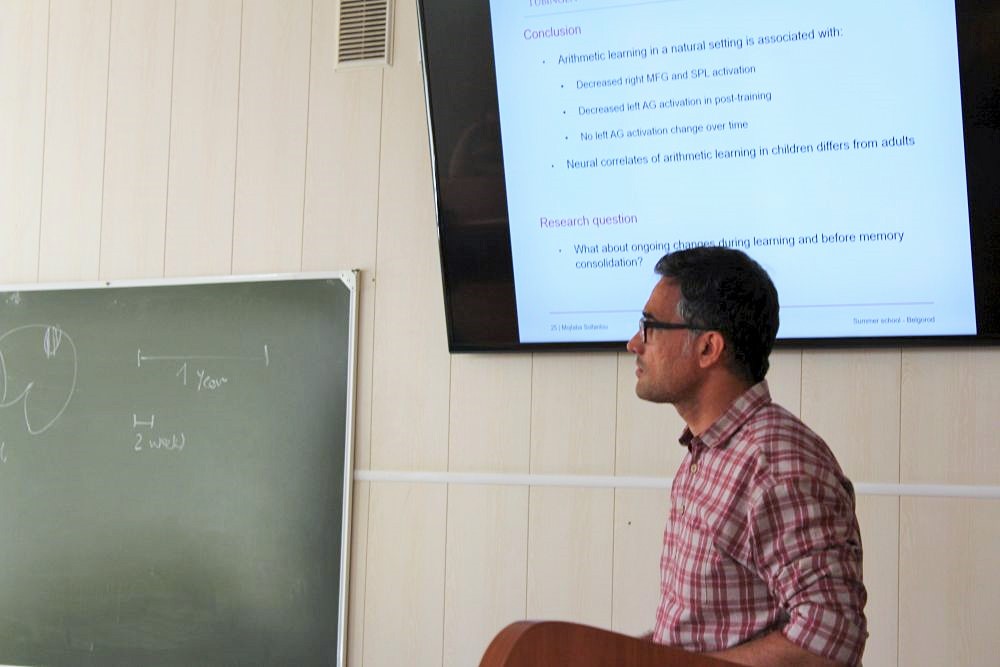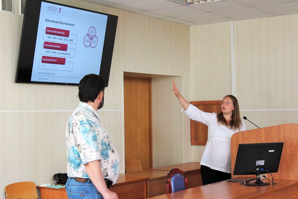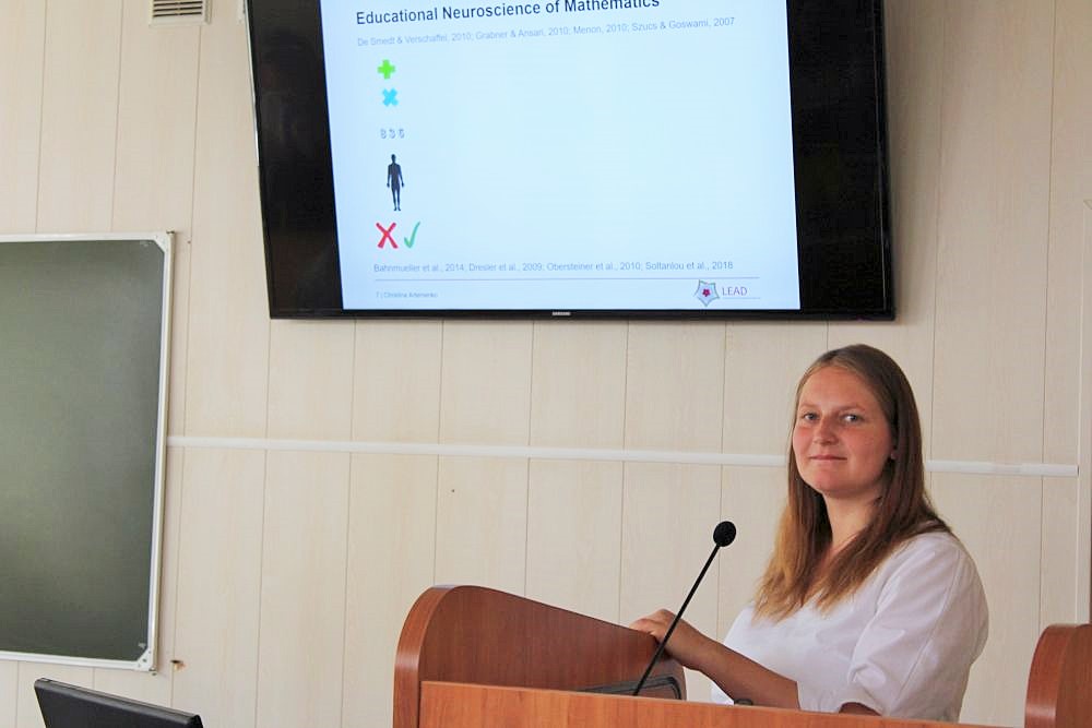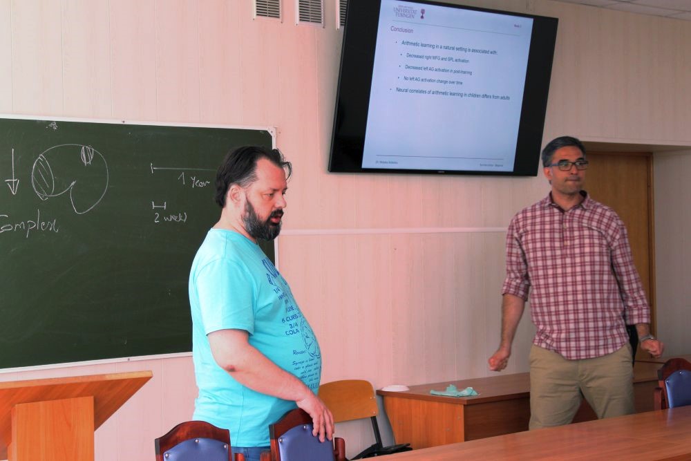 Европейские учёные поделились своими наработками в области нейронаук со студентами и преподавателями. Кристина Артеменко (Университет г. Тюбинген, Германия) представила результаты проведенных научных исследований по изучению математических навыков и способностей в рамках образовательной нейронауки. В исследованиях применялись современные методы картирования мозга, такие как, совместная регистрация данных с помощью ЭЭГ и fNIRS-томографии, а также методы электростимуляции мозга. В своей лекции Моштаба Солтанлоу (Университет г. Тюбинген, Германия) затронул вопрос о развитии математических навыков и способностей в детстве и в школьные годы. Основываясь на данных, проведённых в последние годы, исследования показали, какие области головного мозга активируются у детей в процессе решения простых и сложных математических задач.