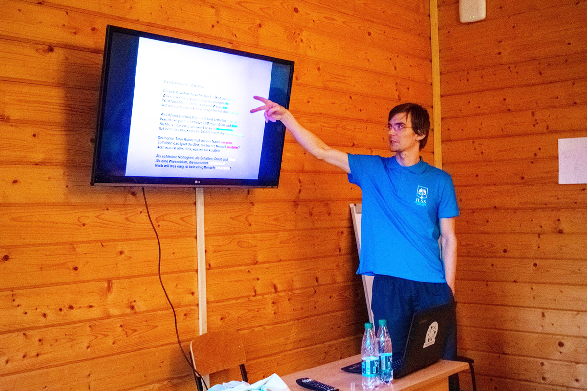 На встрече с молодым журналистом и преподавателем немецкого языка Нильсом Бикенбахом участники языковой школы осваивали основы стихосложения. Нильс рассказал о европейской литературе, музыке, ораторском искусстве, разобрал со студентами такие понятия, как ритм, рифма, мелодика, полезные при написании стихотворений. На практическом опыте молодые люди постигали стихосложение на нескольких языках. На поэтическом вечере царила английская, немецкая, испанская поэтическая классика.