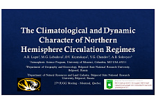 Результаты изучения крупномасштабных атмосферных процессов, как одного из важнейших факторов формирования климата и динамика таких климатических характеристик как температура и осадки, показали рост среднегодовых значений указанных показателей на обоих материках (на примере модельных регионов - Белгородской области и штата Миссури), но в белгородском регионе рост количества осадков не компенсирует увеличение температур теплого времени года, что говорит о тенденции к усилению засушливости в центральной части Восточной Европы.