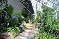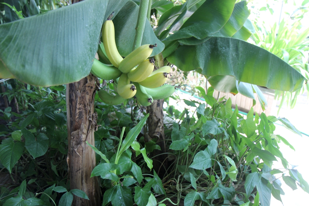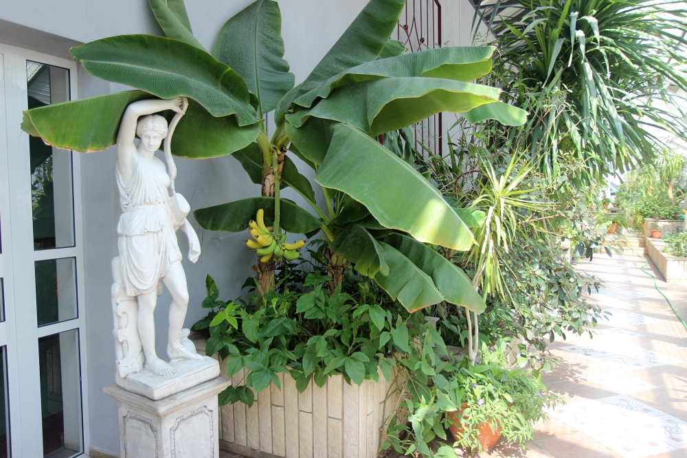 Бананы в зимнем саду университета появились в 2002 году. Коллекция насчитывает два вида экзотических растений – банан Баджио (Musa basjoo) и банан карликовый (Musa acuminate). Последний зацвёл в этом году в марте. Гигантская гроздь, состоящая из 25 плодов, в условиях нашего зимнего сада созревала почти в течение полугода. Кстати, плоды банана принято называть ягодой.