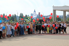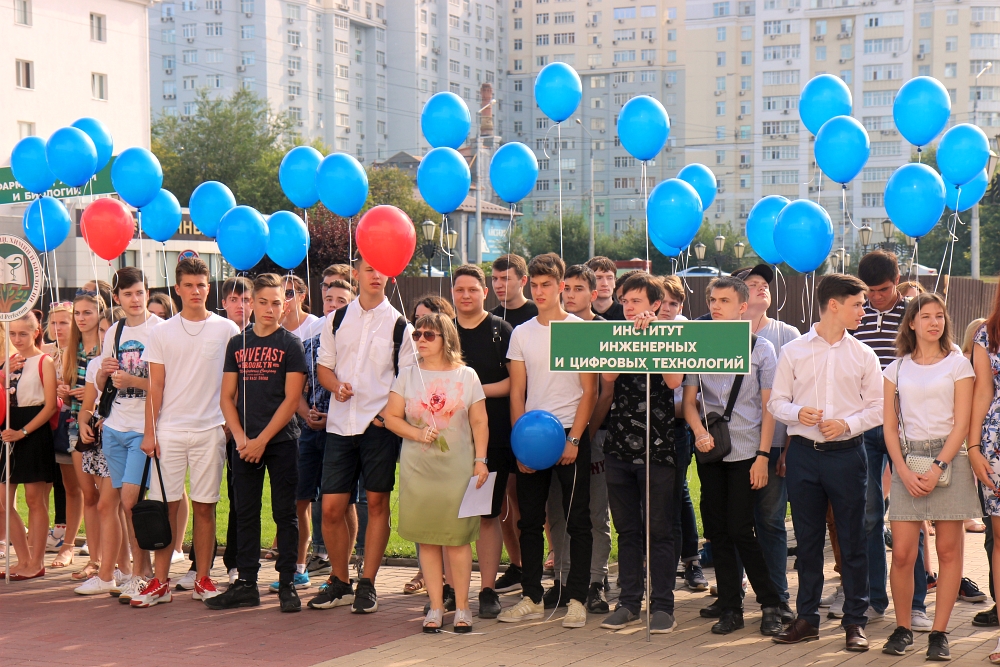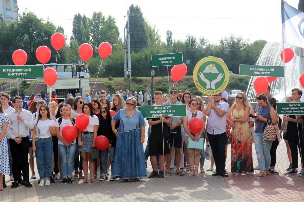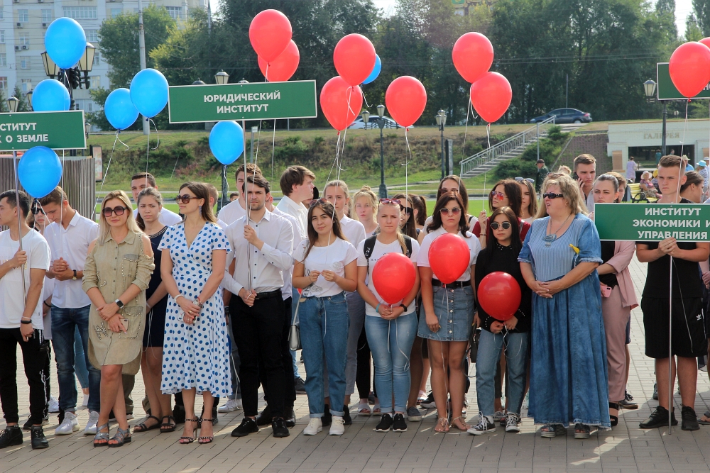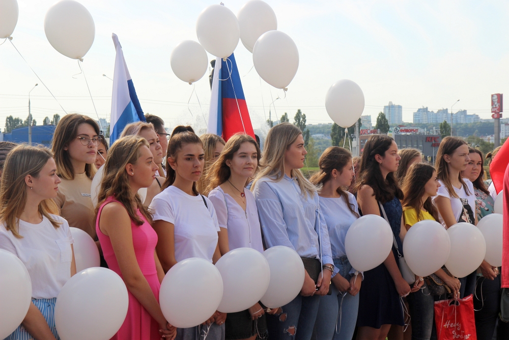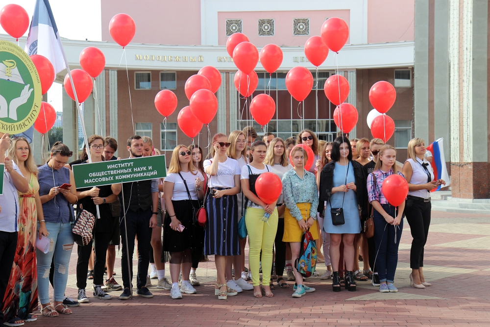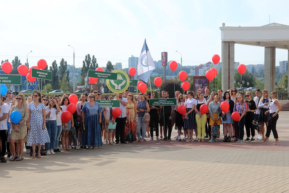 На главной площади Белгородского государственного национального исследовательского университета собрались первокурсники-волонтёры, преподаватели и сотрудники вуза