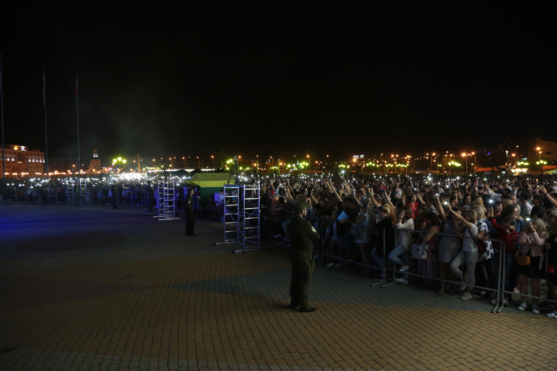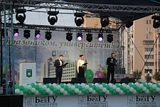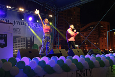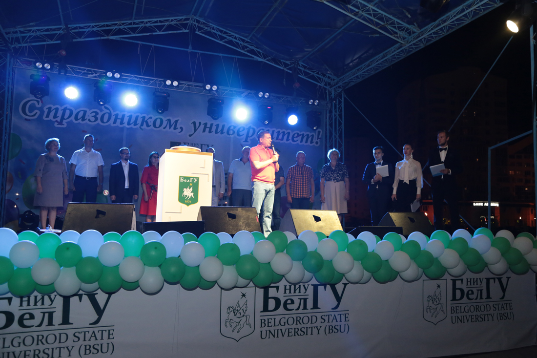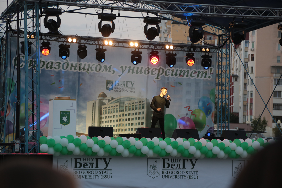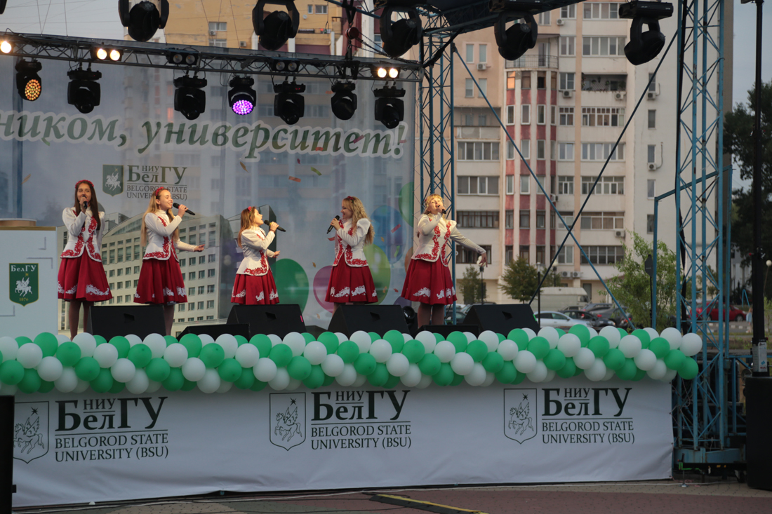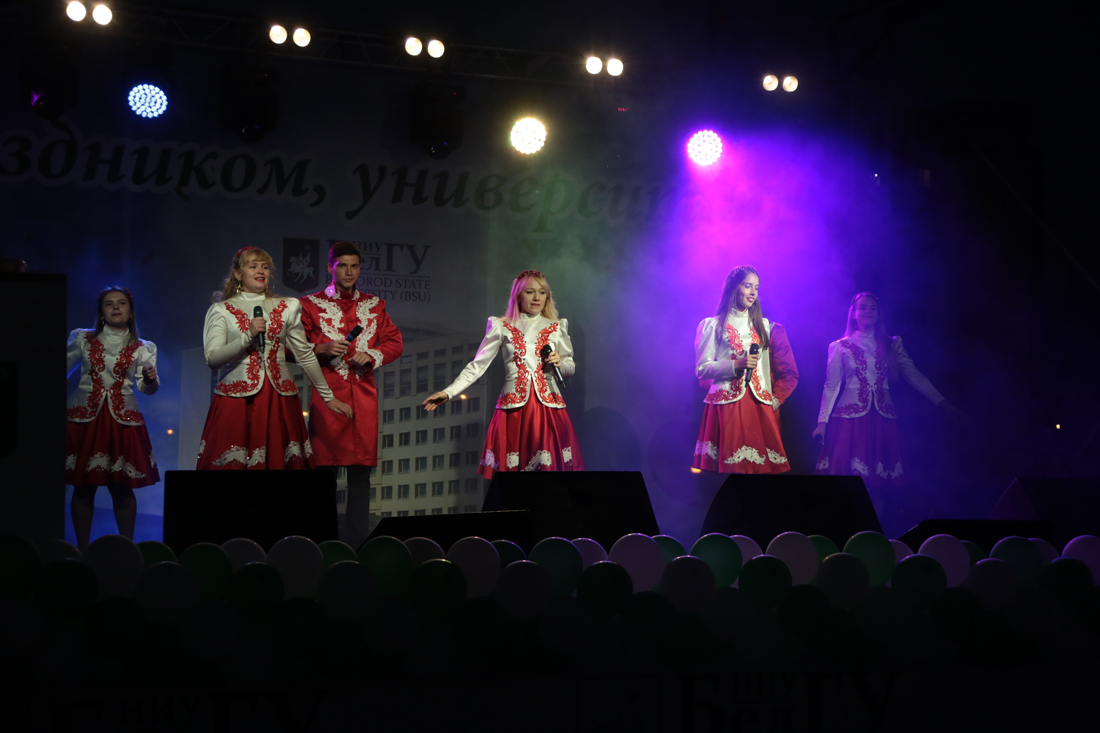 Насыщенную программу продолжил праздничный концерт творческих коллективов вуза, представивших яркие и динамичные номера. Выступления представили солисты и танцоры ансамблей «Отрада», группы «31 регион», арт-студии «Вереск», балета «Мариданс» и др. В вечернем небе под бурные овации был запущен аэростат с символикой НИУ «БелГУ», после чего на сцену поднялись долгожданные участники праздничного вечера – популярная группа «Мохито».