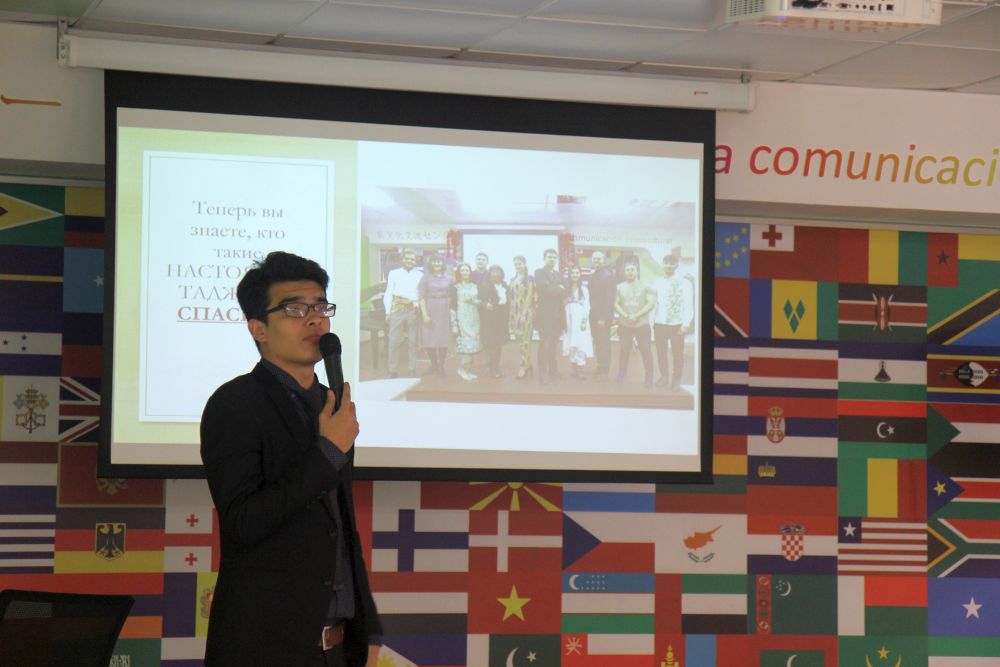 На мероприятии таджикского землячества собрались кураторы и студенты землячеств Индии, Африки, стран Латинской Америки, арабских стран, Вьетнама, Китая, Туркменистана, Афганистана и, конечно, студенты из России. Студент института общественных наук и массовых коммуникаций Мирзоанис Якубов выступил с презентацией, в которой рассказал о том, как в 1991 году Таджикская ССР стала Республикой Таджикистан, какие положительные и печальные последствия независимости испытала на себе страна, а самое главное, каков он, нынешний самостоятельный и суверенный Таджикистан.