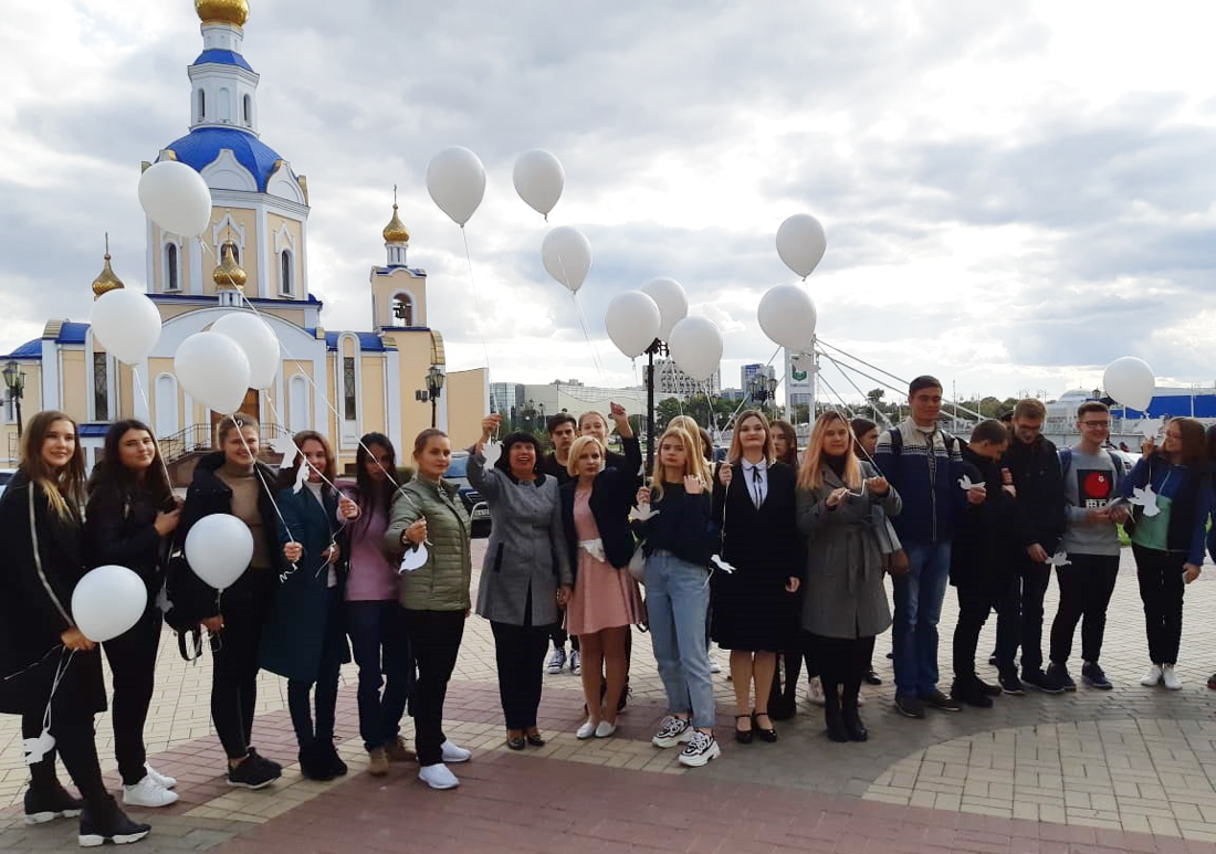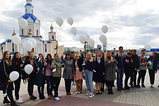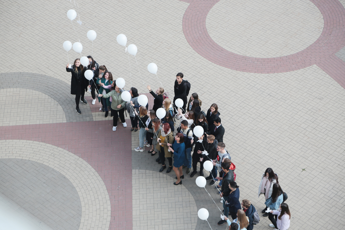 Завершилась акция «Голубь мира» у храма Архангела Гавриила красочным флешмобом, где студенты выстроившись хороводом, изобразили флаг и выпустили в небо шары белого цвета – символа чистоты, невинности, молодости, света и радости.
