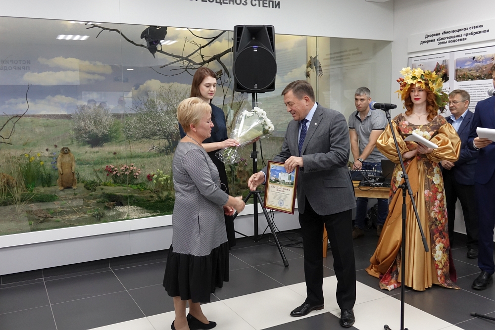Ректор поблагодарил всех, кто имел отношение к созданию нового объекта университета и вручил Благодарственное письмо директору экспозиционно-выставочного центра «Природа Белогорья», профессору Марине Гречитаевой.