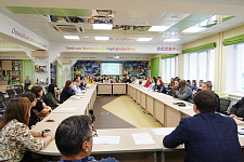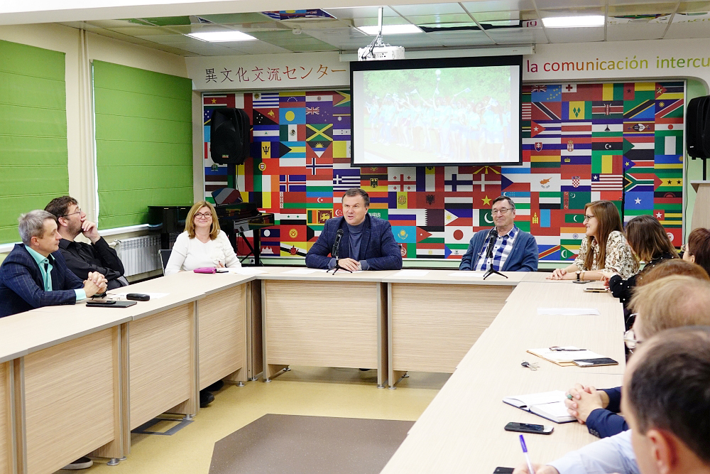 На встрече, прошедшей в формате круглого стола, присутствовали проректор по образовательной деятельности Александр Маматов, сотрудники центра иноязычного образования и академического письма департамента образовательной политики Валентин Доборович и Лариса Цурикова, а также заместители директоров институтов по международной деятельности, волонтёры и преподаватели Международной языковой летней школы, студенты 1-2 курсов.