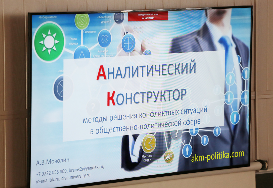 Андрей Мозолин имеет более двадцати лет опыта в области управления и аналитического обеспечения информационной политики органов власти и коммерческих компаний. Автор системы мониторинга конфликтных\проблемных ситуаций в муниципалитетах Свердловской области (в разные периоды отслеживалось от 10 до 28 городов области). Автор «Концепции информационной политики муниципалитета». Опубликовал 70 научных статей и монографий по проблемам управления информацией. Стажировался в университетах Канады и Германии, а также в Институте Социологии РАН. Разработал 32 авторских курса, в том числе «Методы информационного массового воздействия», «Информационная политика органов власти», «Основы пропаганды» и др. «Аналитический Конструктор» — это алгоритм быстрого анализа конфликтов на основе неполных данных, позволяющий вырабатывать эффективные решения. «АК» разработан на основе анализа 200 ситуаций, возникавших в различных регионах РФ.
