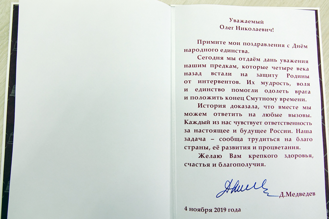 В адрес ректора НИУ «БелГУ» Олега Полухина пришло поздравление с Днём народного единства от премьер-министра Дмитрия Медведева.