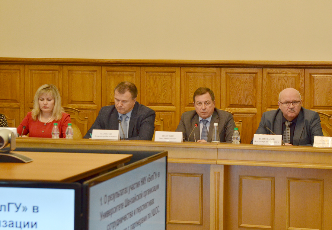 Участниками заседания стали представители ректората, директора и деканы институтов и факультетов, руководители структурных подразделений вуза, студенты. Проректор по международному сотрудничеству Владислав Кучмистый рассказал о результатах участия НИУ «БелГУ» в Университете Шанхайской организации сотрудничества и перспективах взаимодействия с партнёрами по УШОС. Владислав Анатольевич, отметив важность участия университета в развитии УШОС, представил краткую справку о присутствии НИУ «БелГУ» в сетевом университете. Он обозначил преимущества участия в УШОС, среди которых – повышение имиджа университета как члена крупного международного сетевого университета и увеличение контингента иностранных обучающихся из стран ШОС, рост числа совместных сетевых образовательных программ, реализуемых с вузами-партнёрами в рамках УШОС. Ключевыми задачами, решение которых необходимо для развития сотрудничества в рамках Университета ШОС, по мнению докладчика, являются: интенсификация взаимодействия с партнёрами для обеспечения контингентом всех программ, реализуемых в рамках УШОС, расширение числа партнёров для разработки и реализации совместных образовательных программ и др.