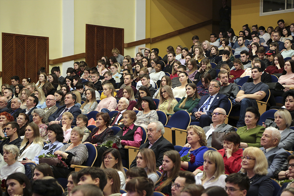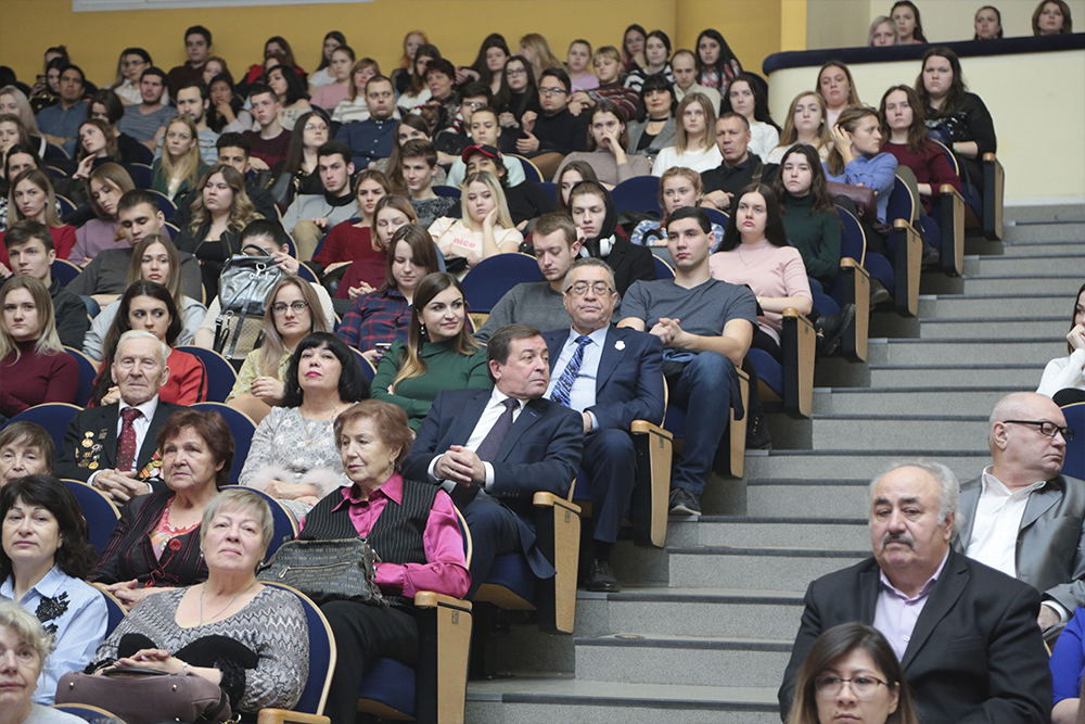 Представители студенческого актива университета выразили слова благодарности и вручили цветы почетному профессору университета Петру Григорьевичу Коняеву, ветеранам, воевавшим на фронтах Великой Отечественной войны, труженикам тыла, детям войны, ветеранам боевых действий, офицерам в отставке, а также присутствовавшим в зале бойцам отрядов ОМОН и СОБР.