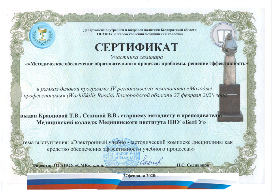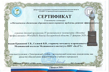 В соревнованиях по стандартам WorldSkills Russia приняли участие 183 конкурсанта, их работу оценивал 241 эксперт. В группу экспертов-компатриотов соревнования вошли представители медицинского колледжа НИУ "БелГУ" Ирина Курмагей и Ирина Дворяшина. Региональный этап соревнований проходил по 24 компетенциям. Победителям и призёрам вручены 99 медалей. Среди призёров - обучающаяся медицинского колледжа медицинского института НИУ «БелГУ» Ангелина Беляева. Ангелина завоевала бронзу в компетенции «Медицинский и социальный уход». В рамках деловой программы чемпионата "Молодые профессионалы" состоялся круглый стол "Сестринское образование: проблемы и перспективы", в котором приняли участие представители медколледжа НИУ "БелгУ" Татьяна Кравцова и Виктория Селина.
