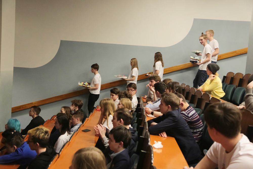 Студенты-первокурсники подготовили для зрителей театрализованное представление, рассказали о событиях, которые произошли 14 марта в разные годы. Речь шла о выходе в свет в 1564 году первой русской печатной книги «Апостол» Ивана Фёдорова, об изобретении первого очистителя хлопкового волокна, создании первого видеомагнитофона, рождении физика Альберта Эйнштейна. Зрителям показали видеофильм о жизни учёного и другие научно-популярные ролики. Студенты спели песню о числе π и стали участниками флешмоба, выстроившись по его форме. Для всех гостей праздника по традиции был подготовлен сюрприз – пироги с символикой этого удивительного числа.