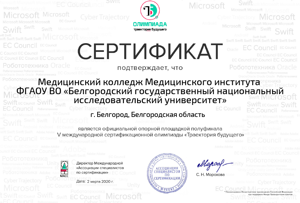 На основании соглашения НИУ «БелГУ» стал официальной опорной площадкой регионального этапа V международной олимпиады «Траектория будущего». В нём приняли участие свыше 600 обучающихся медицинского колледжа. В полуфинал вышли 117 студентов колледжа, из них 77 получили международные сертификаты.