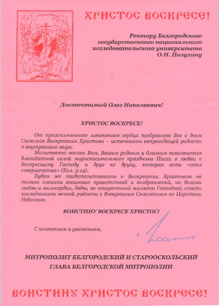 В своём послании на имя ректора НИУ «БелГУ» профессора Олега Полухина, митрополит Белгородский и Старооскольский Иоанн призвал руководство и коллектив вуза «свидетельствовать о Воскресении Христовом не только словами взаимных приветствий и поздравлений, но делами любви и милосердия, дабы, по неизреченной милости Господней, стать наследниками вечной радости с Воскресшим Спасителем во Царствии Небесном». Митрополит пожелал всем «наполниться благодатной силой мироспасительного праздника Пасхи в любви к Воскресшему Господу и друг ко другу, которая есть «союз совершенства».