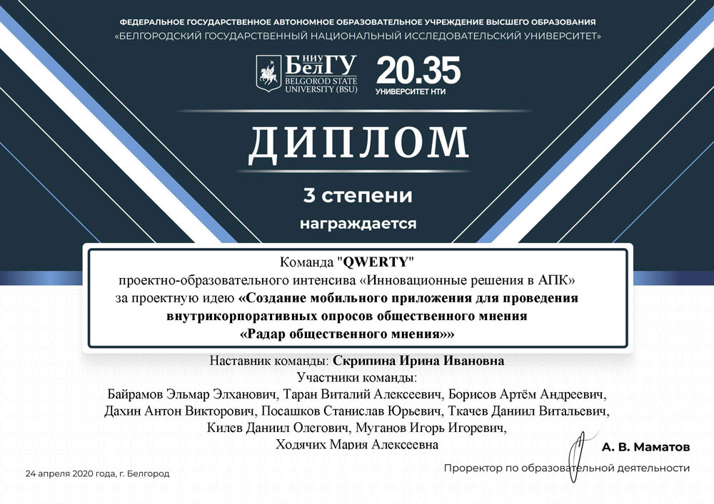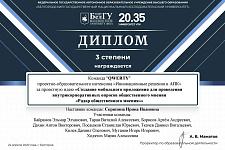 - III место – команда «QWERTY» с проектом «Создание мобильного приложения для проведений внутрикорпоративных опросов общественного мнения «Радар общественного мнения», наставник Ирина Скрипина.