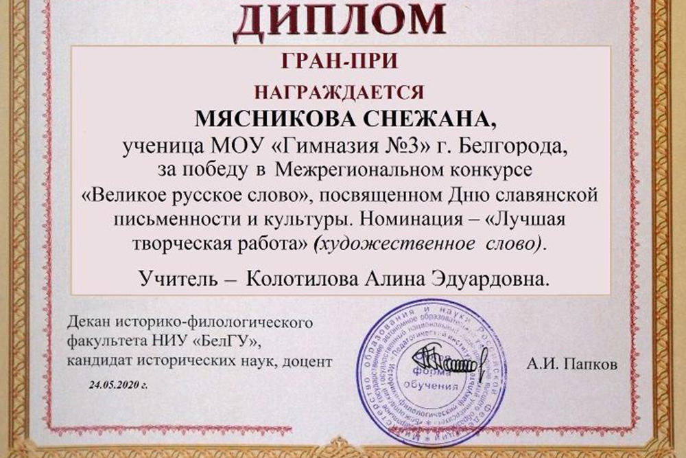 Мясникова Снежана (МОУ «Гимназия № 3» г. Белгорода), учитель – Колотилова Алина Эдуардовна).