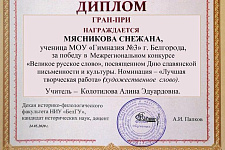 3 место – Белых Анна (МБОУ «Гимназия № 2» города Белгорода), учитель – Ануфриева Екатерина Васильевна; Павленко Даниил (МОУ «Майская гимназия Белгородского района Белгородской области»), учитель – Проненко Вера Михайловна; Рябоконь Софья (МОУ «Майская гимназия Белгородского района Белгородской области»), учитель – Корнейко Елена Александровна.