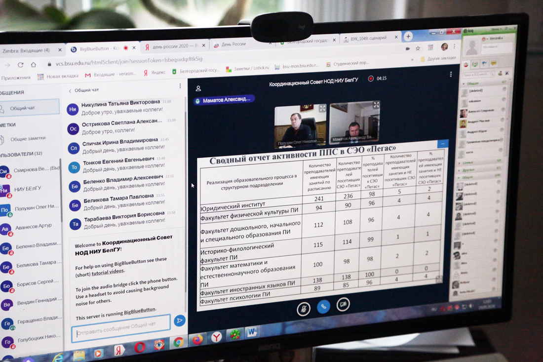 Проректор по образовательной деятельности Александр Маматов проинформировал членов совета об организации учебного процесса, а также об аттестационных испытаниях, стартовавших на этой неделе в режиме онлайн. Александр Васильевич отметил, что посещаемость занятий в электронной системе «Пегас» остаётся стабильной - двадцать тысяч посетителей в день. Посещения преподавателей и студентов достигли в начале этой недели максимальной отметки – 98,88 процента. Однако наблюдаются и пропуски занятий, причем как студентами, так и преподавателями. Ректор НИУ «БелГУ» Олег Полухин дал поручение составить сводный отчёт институтов по имеющимся пропускам и принять меры по недопущению подобных случаев.