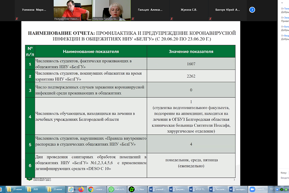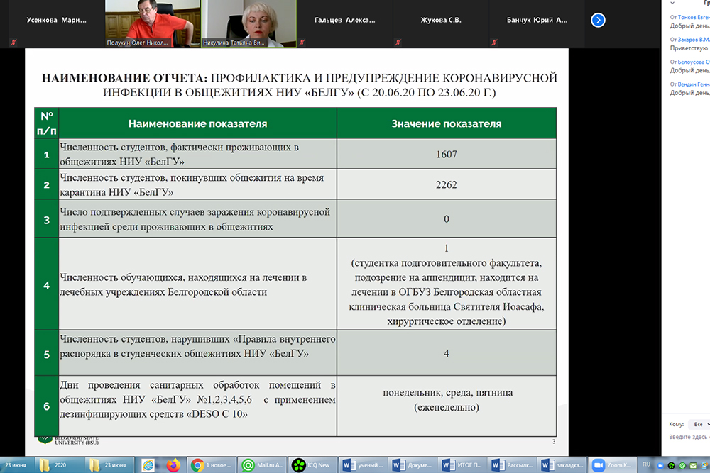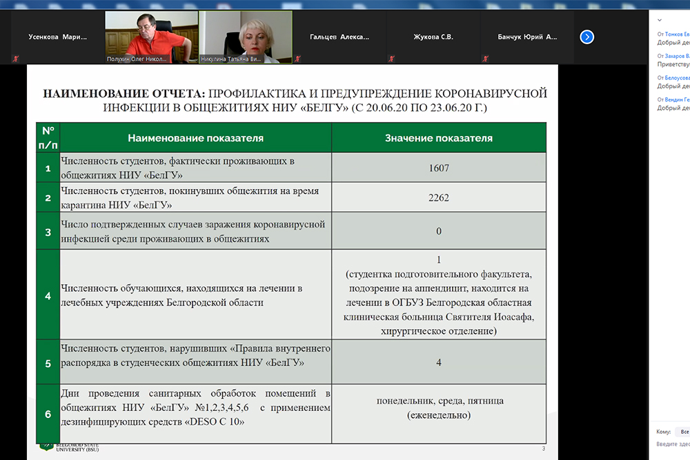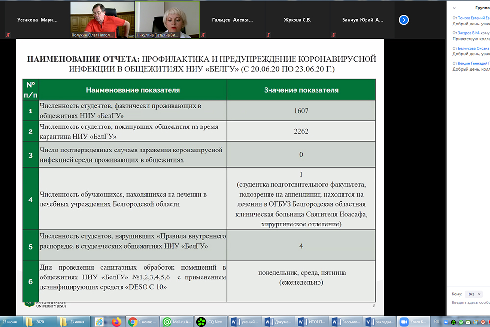 В ходе заседания был рассмотрен вопрос обеспечения санитарно-эпидемиологической защиты студентов, проживающих в общежитиях университета. Директор департамента социальной политики Татьяна Никулина сообщила, что в общежитиях сегодня остаётся 1607 человек, 87 из которых граждане РФ. Случаев коронавирусной инфекции у них не зафиксировано, санитарная обработка помещений проводится регулярно.