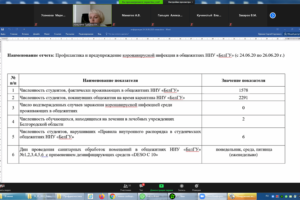 В ходе заседания был рассмотрен вопрос обеспечения санитарно-эпидемиологической защиты студентов, проживающих в общежитиях университета. Директор департамента социальной политики Татьяна Никулина сообщила, что в общежитиях сегодня остаётся 1578 человек. Случаев коронавирусной инфекции у них не зафиксировано, санитарная обработка помещения проводится регулярно.