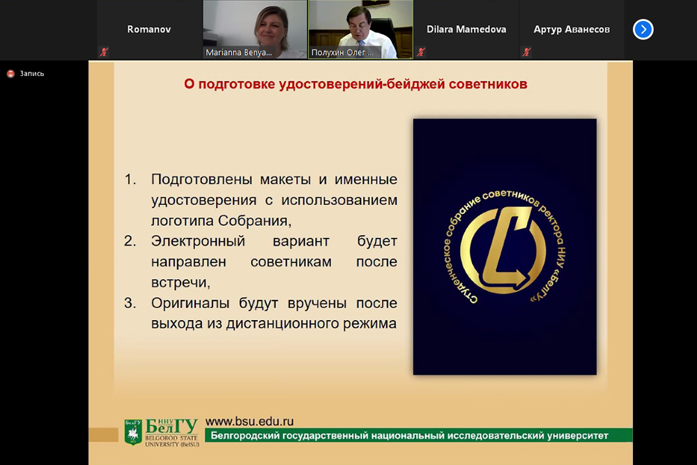 Советники представили Олегу Николаевичу ряд инициатив, которые были одобрены и поддержаны. Студент института межкультурной коммуникации и международных отношений НИУ «БелГУ» Артур Аванесов доложил о сроках полномочий советников ректора и формирования нового созыва Собрания, предложив в связи с пандемией коронавируса продлить полномочия текущего созыва до декабря, а отбор новых кандидатур проводить заблаговременно до истечения полномочий.