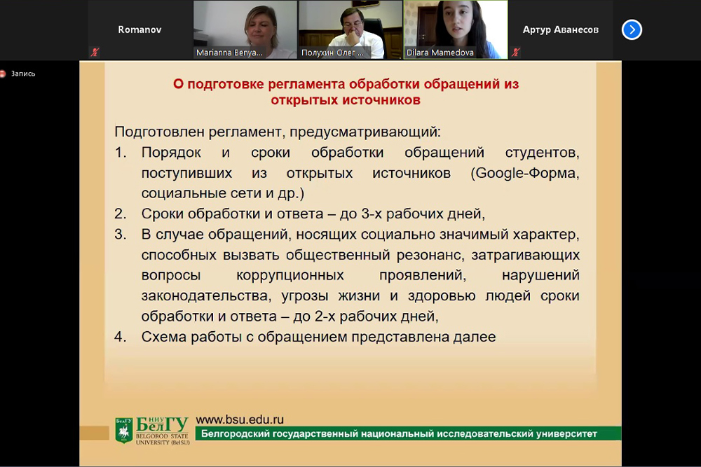 В НИУ «БелГУ» состоялась итоговая в этом учебном году онлайн-встреча Олега Полухина с представителями Собрания советников ректора из числа обучающихся II созыва