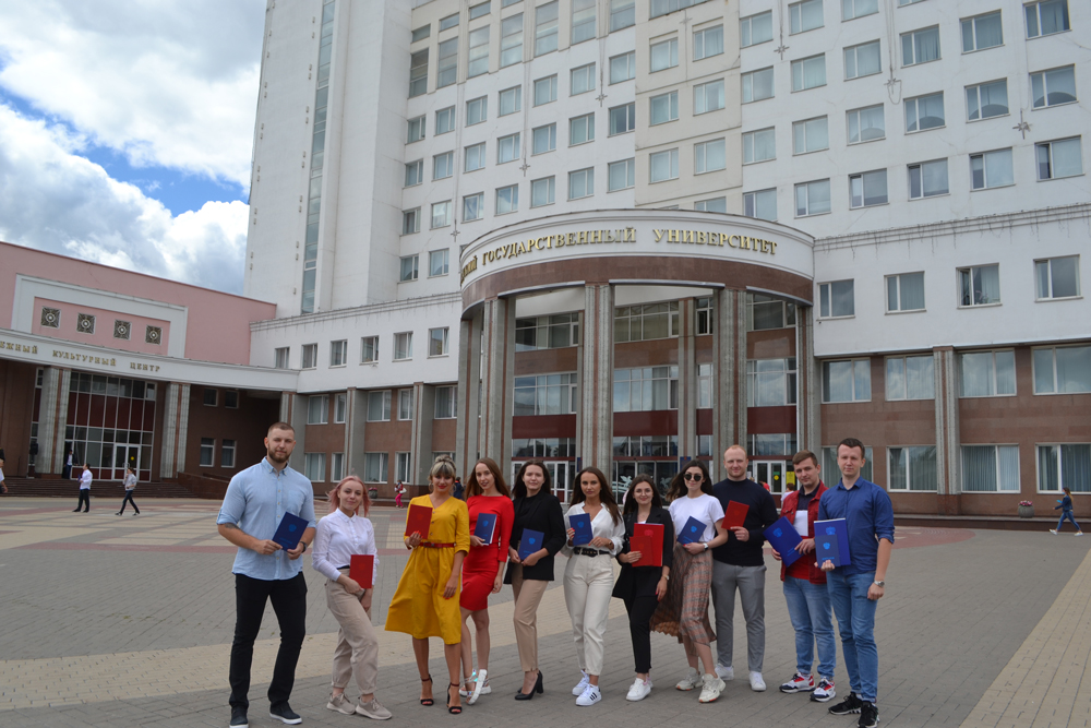 После получения документов об образовании выпускники сфотографировались на фоне университета и у фигуры Профессора скульптурной композиции «Вручение диплома».
