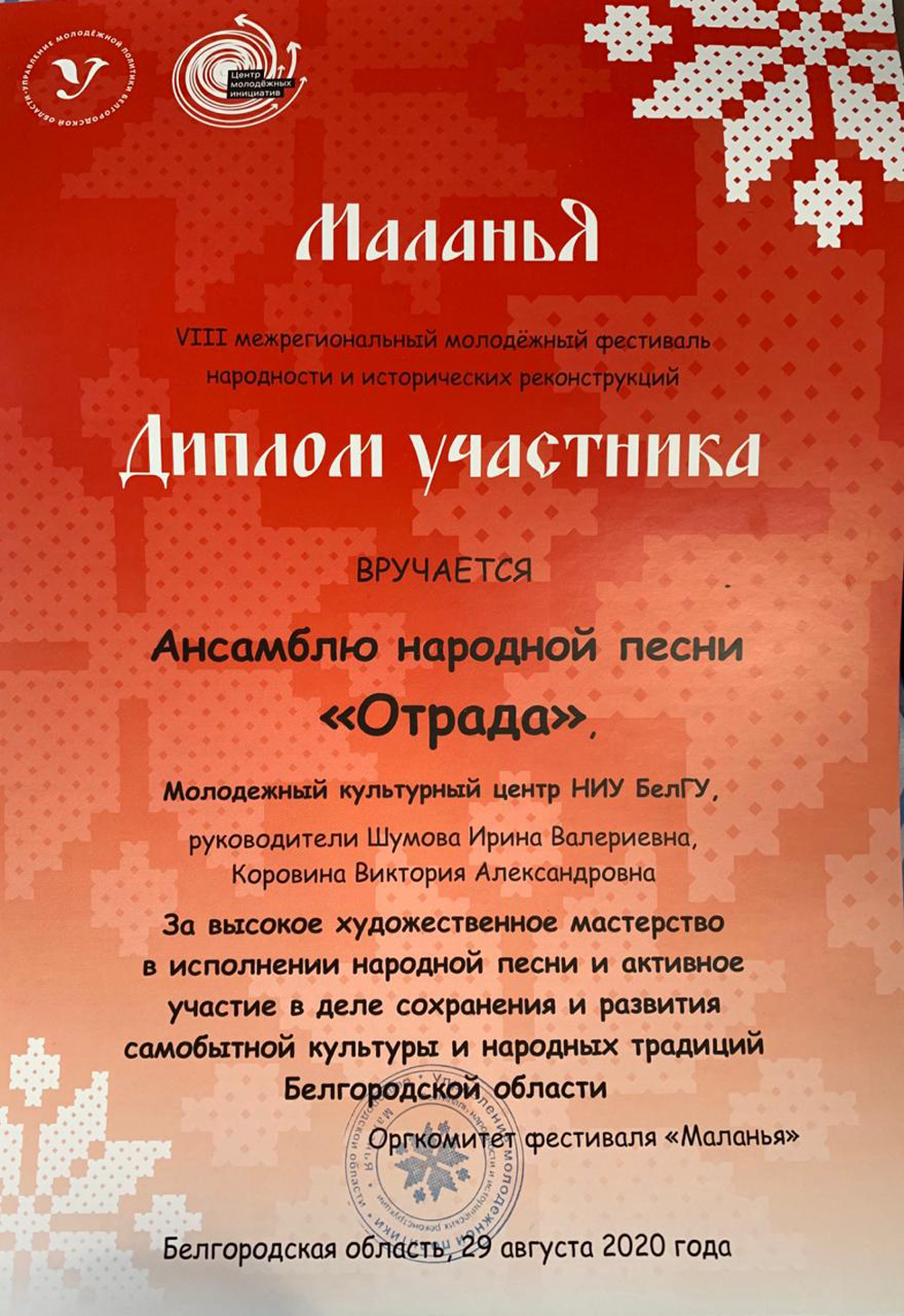 По традиции местом проведения фестиваля стало село Кострома Прохоровского района Белгородской области. Ансамбль народной песни «Отрада» является постоянным участником культурного мероприятия. Коллектив порадовал зрителей песней «Четыре двора». Руководитель народного коллектива Виктория Коровина отметила, что в свете последних событий и ограничений, вызванных распространением коронавируса, артисты собрались впервые за долгое время.