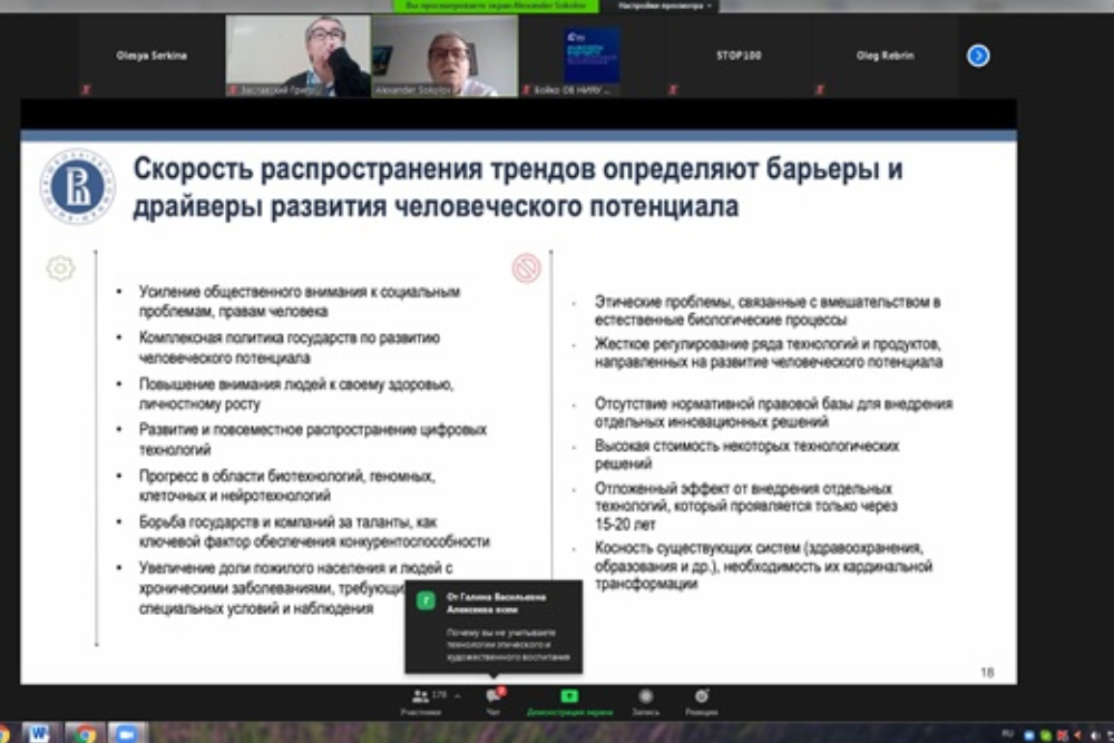 Директор Форсайт-центра Института статистических исследований и экономики знаний НИУ «ВШЭ» Александр Соколов представил актуальное исследование трендов развития человеческого потенциала в XXI веке, особо подчеркнув, что в последние годы люди, их навыки, знание, умение креативно мыслить, способность эффективно трудиться и адаптироваться к технологическим изменениям становятся основным фактором конкурентоспособности любого государства. На этом фоне происходит переход от понятия «профессии» к понятию «портфель компетенций», что необходимо учитывать при формировании образовательной повестки высшей школы.