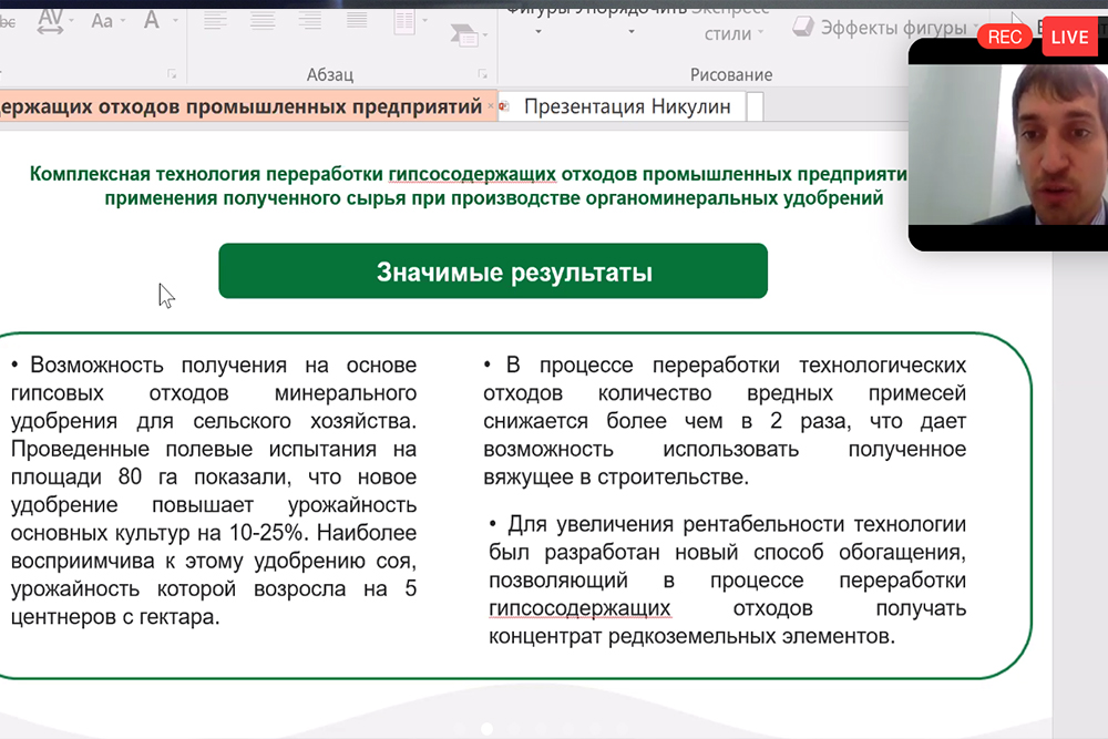 Директор инжинирингового центра НИУ «БелГУ» кандидат физико-математических наук, доцент Иван Никулин выступил модератором дискуссии «Новые материалы и способы конструирования», в рамках которой поделился опытом решения проблемы переработки гипсосодержащих отходов промышленных предприятий. По словам Ивана Сергеевича, разработанная в НИУ «БелГУ» технология, в отличие от конкурентных, может использоваться комплексно: в сельском хозяйстве при производстве серосодержащего органоминерального удобрения с увеличенным содержанием азота; в строительстве для изготовления гипса марки Г5 и извлечении полезных веществ (редкоземельных металлов, стронция, фосфора и т.д).