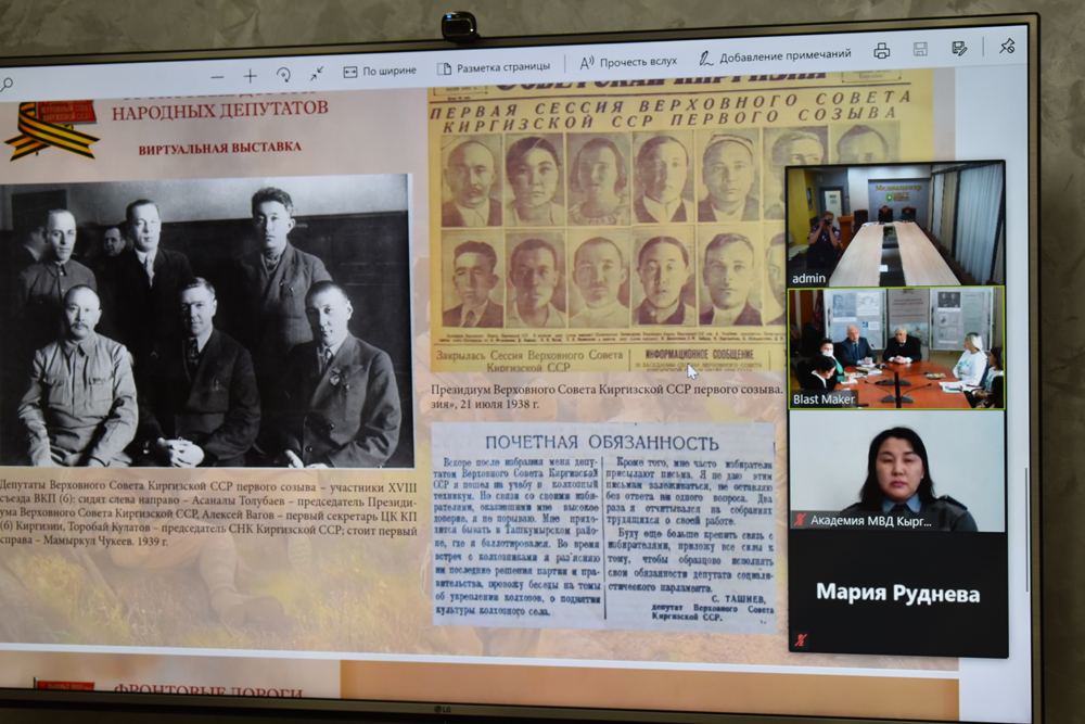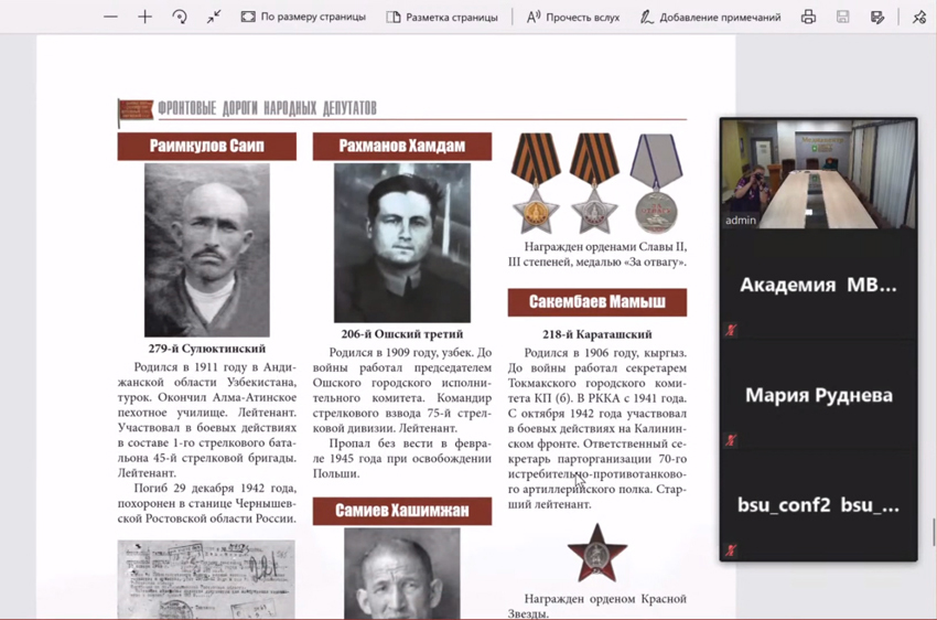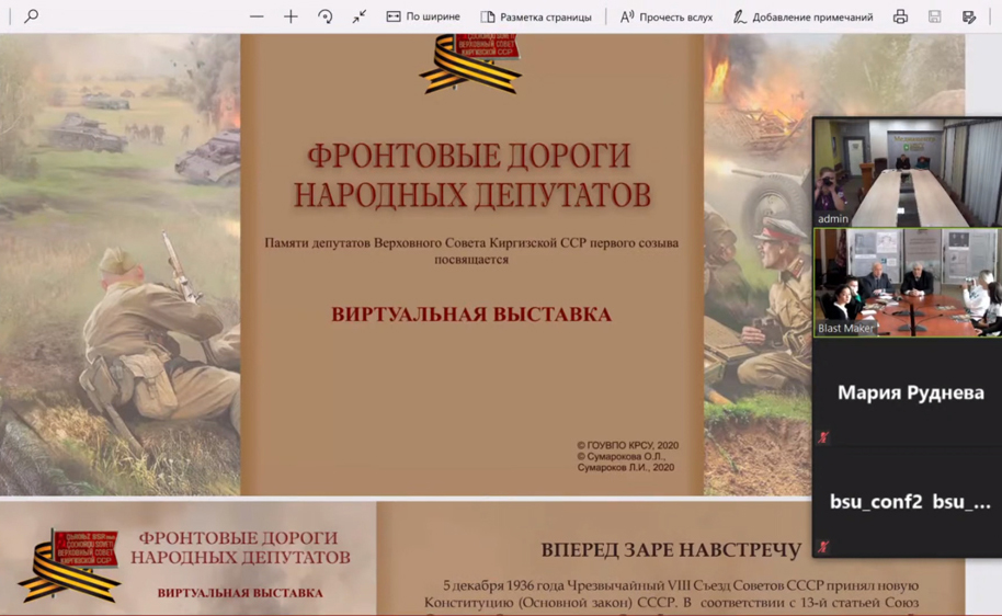 Телемост был приурочен к Году памяти и славы и 75-летию годовщины Победы в Великой Отечественной войне 1941-1945 гг. Модератором встречи выступила директор Центра гражданско-патриотического воспитания обучающихся университета Инна Кузнецова, которая рассказала, что книга раскрывает неизвестную страницу деятельности депутатов Верховного Совета Киргизской ССР первого созыва (1938 г.) – их участие в Великой Отечественной войне. Очерки основаны на научном исследовании неизученных прежде архивных материалов. В сборнике описаны примеры самоотверженности и мужества народных избранников на фронтах сражений, в том числе в период Курской битвы.