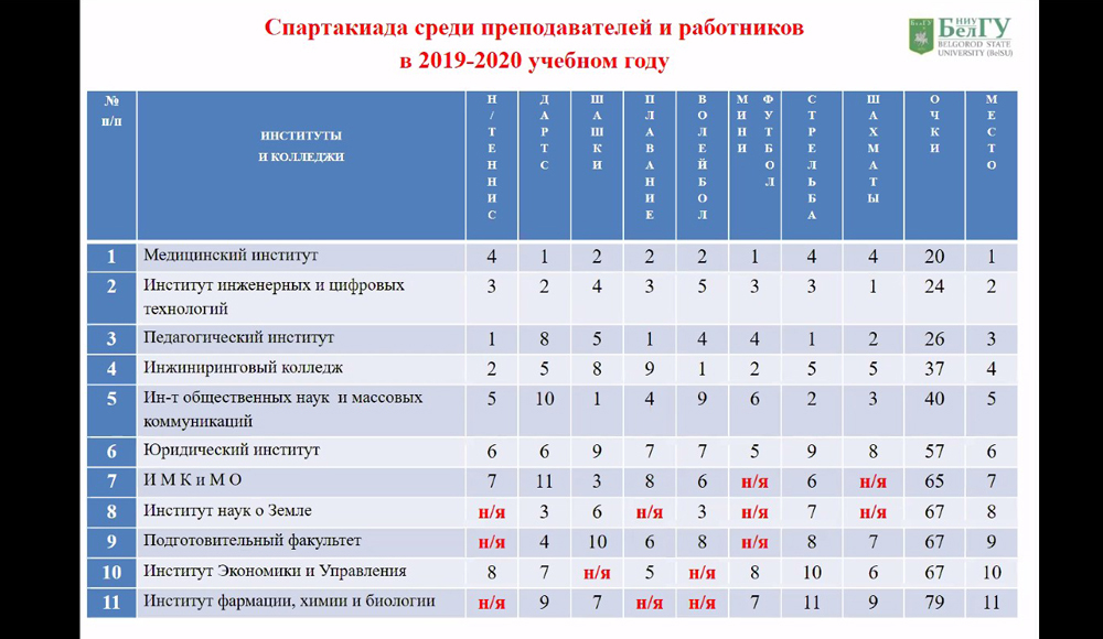 Руководитель Спортивного клуба НИУ «БелГУ» Владимир Руденко подвёл итоги спортивно-массовой работы в 2019-2020 учебном году. Как рассказал Владимир Владимирович, в университете проводились спартакиады, в которых активное участие приняли как студенты землячеств, так и преподаватели и сотрудники. Отметим, что в спортивных мероприятиях участвовали все институты и колледжи. Конечно, пандемия коронавируса внесла свои коррективы в проведение спортивно-массовых мероприятий, однако мероприятия, которые удалось провести до всем известных событий, охватили свыше двух тысяч человек. Владимир Руденко рассказал и о межвузовских соревнованиях, в которых студенты НИУ «БелГУ» стали победителями турниров по волейболу, армспорту, лыжным гонкам, плаванию и заняли второе место в мини-футболе.