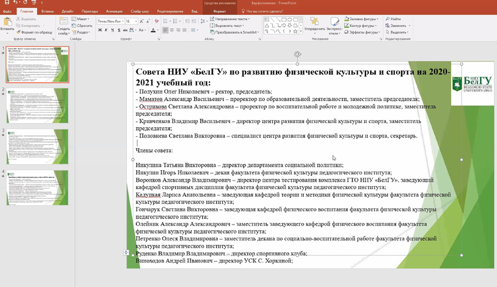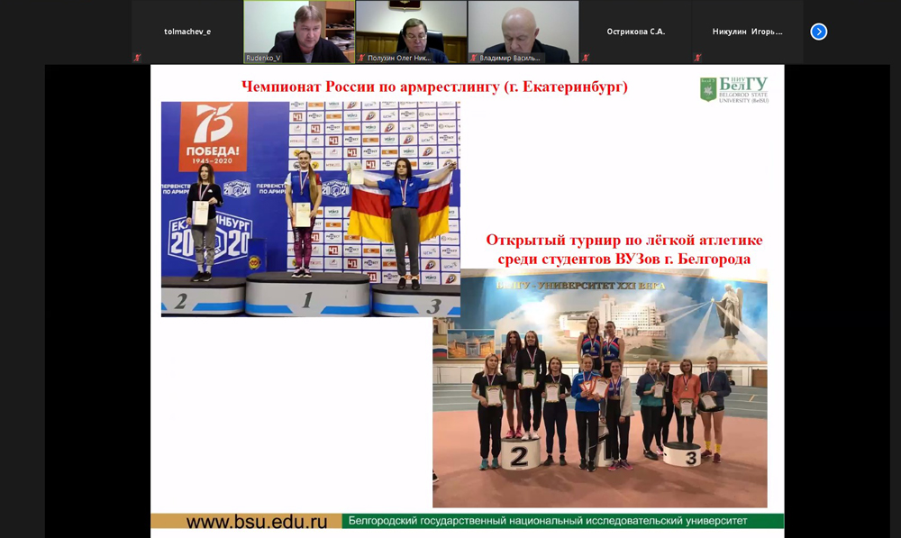 Директор Центра развития физической культуры и спорта, заместитель председателя Совета Владимир Кривченков представил коллегам план работы Совета. Ректор НИУ «БелГУ» Олег Полухин поручил проработать вопрос об организации и проведении праздничного мероприятия по подведению итогов спортивного года, возможно, с использованием дистанционных технологий.