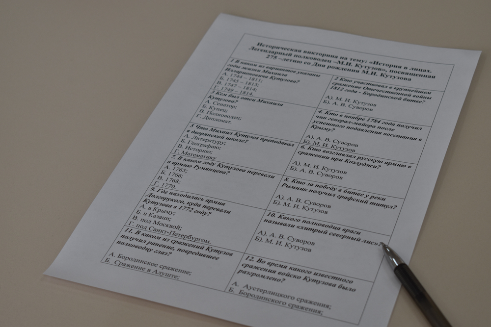 Студенты института экономики и управления, юридического института, института инженерных и цифровых технологий, а также института межкультурной коммуникации и международных отношений приняли участие в цикле исторических викторин: «История в лицах. Легендарные полководцы: М.И. Кутузов, посвящённая 275–летию со Дня рождения М.И. Кутузова, А.М. Василевский, посвящённая 125-летию со Дня рождения маршала А.М. Василевского, а также квест-игре «Историческое значение Куликовского сражения 1380 г.».