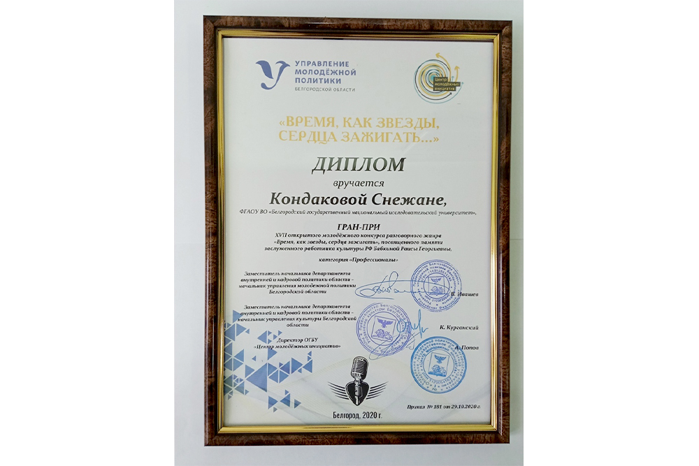 По результатам судейства жюри представители НИУ «БелГУ» удостоились высоких наград. В номинации «Профессионалы» Гран-при конкурса выиграла режиссер-постановщик МКЦ НИУ «БелГУ», руководитель «Школы ведущих» Снежана Кондакова, представившая произведение Иосифа Бродского «Второе Рождество на берегу…».
